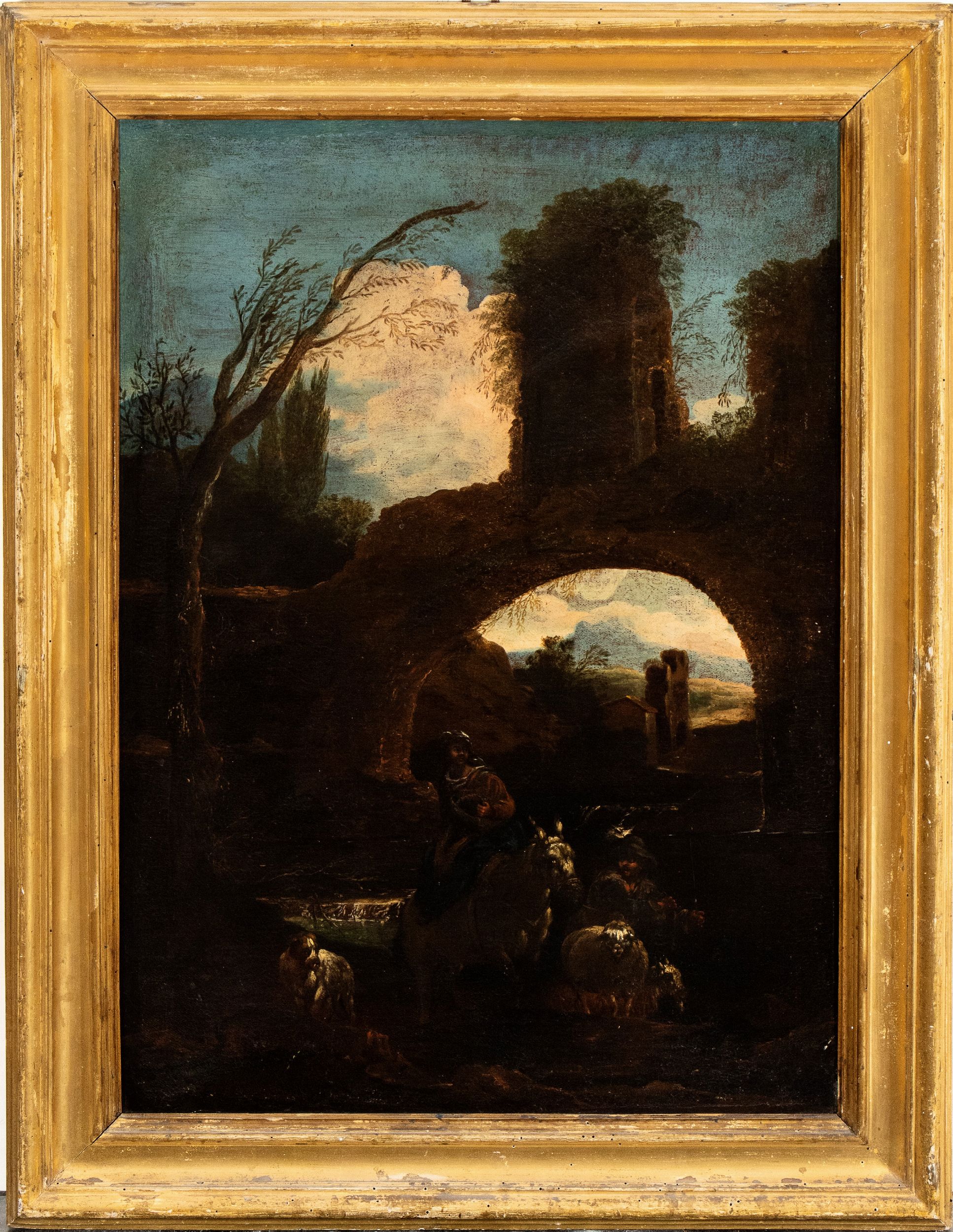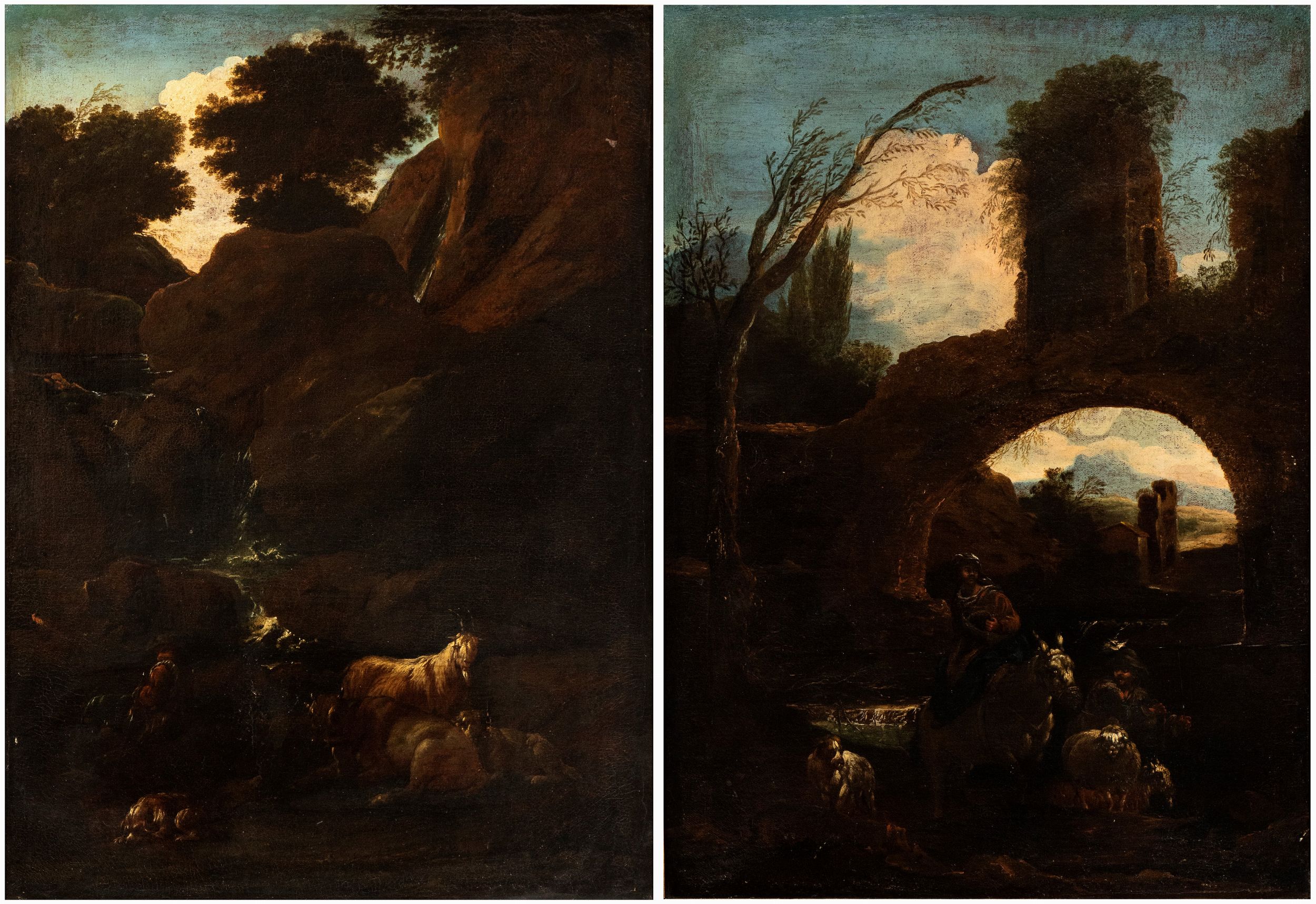 a) Paesaggio con arco in rovina, pastore e armenti; b) paesaggio con corso d'acqua, [..]