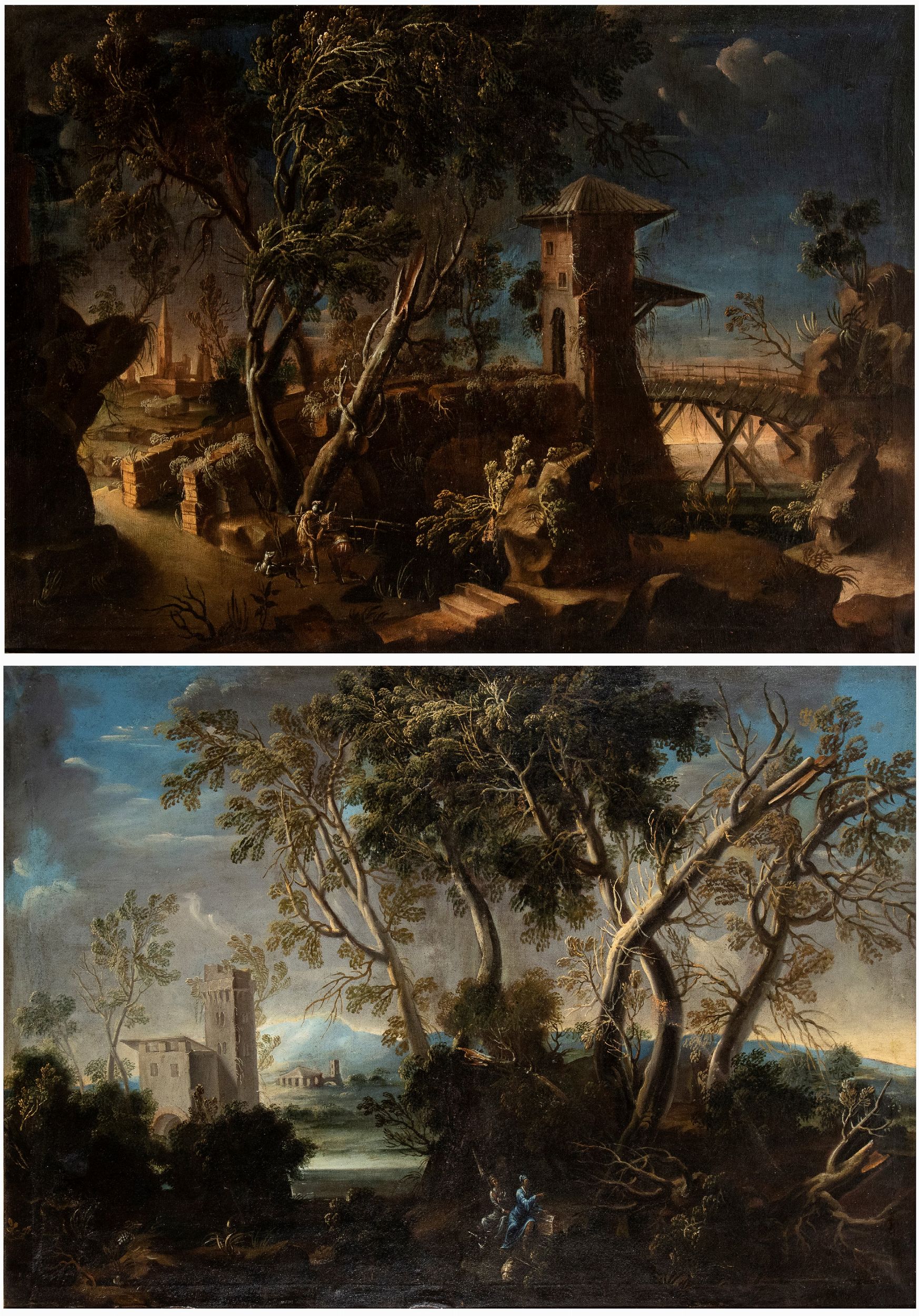 a) Paesaggio con corso d'acqua, cittadella e due figure; b) paesaggio con ponte [..]