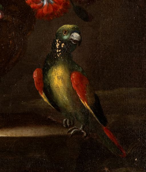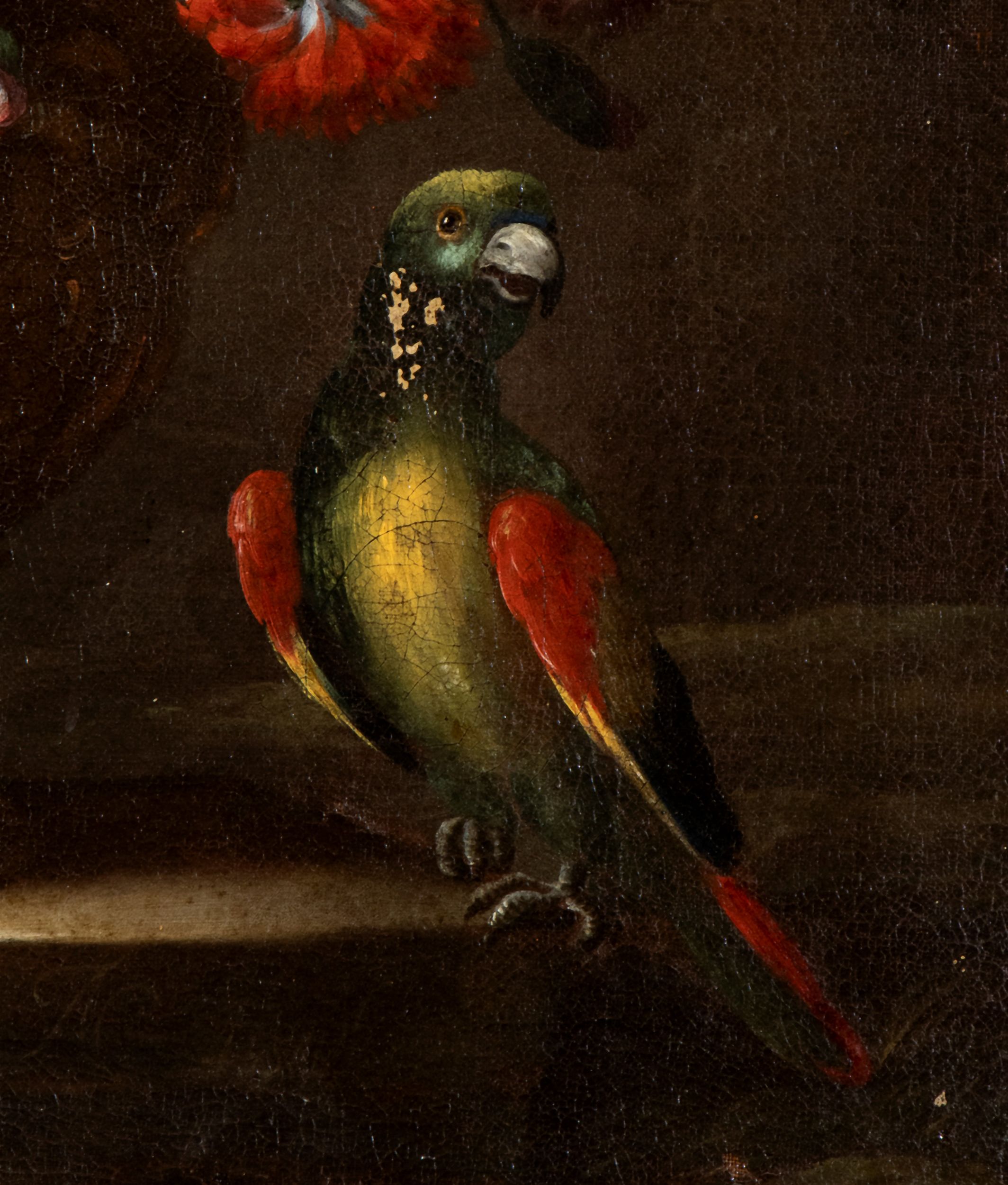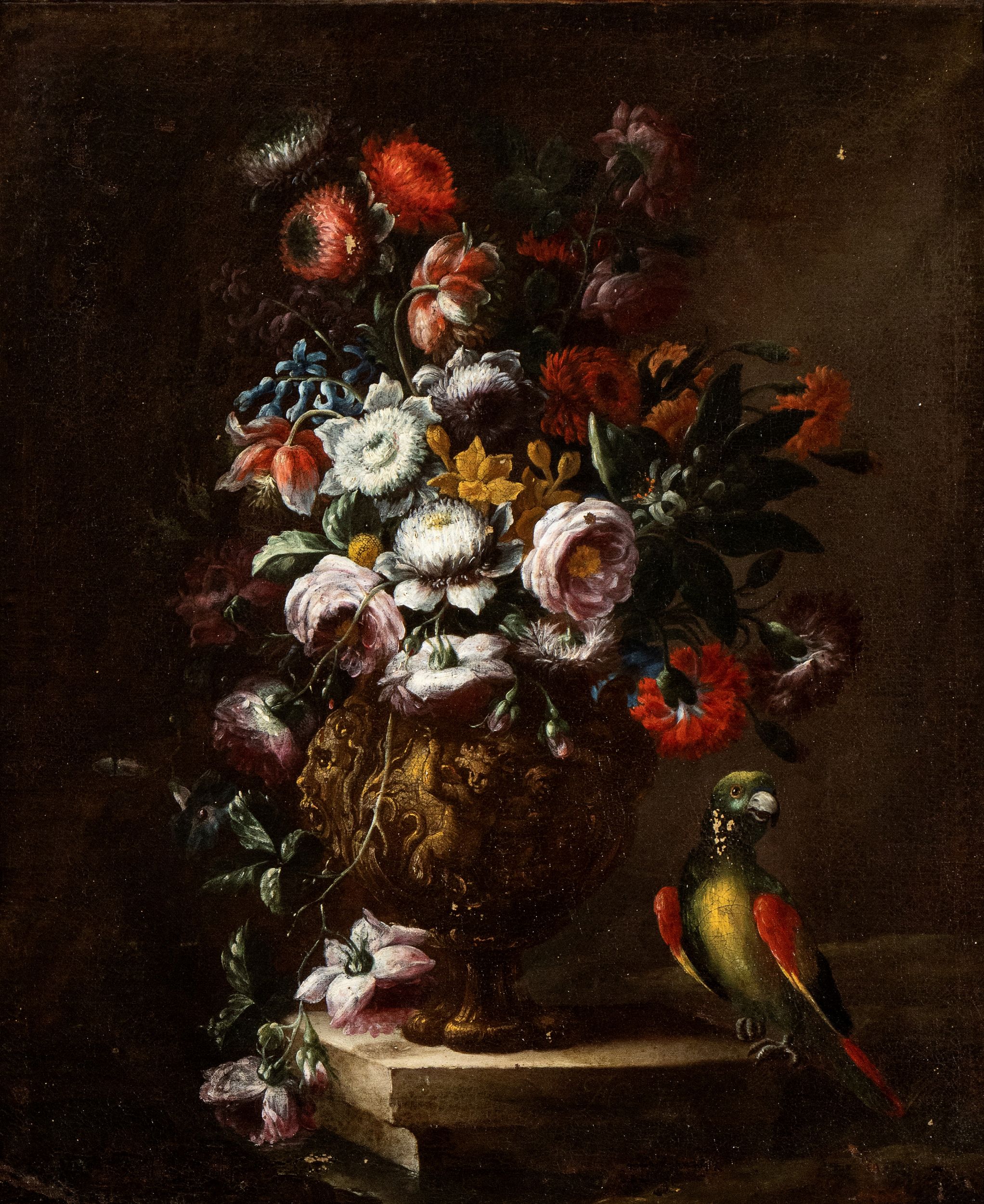 Bouquet di fiori in un vaso metallico, con pappagallo