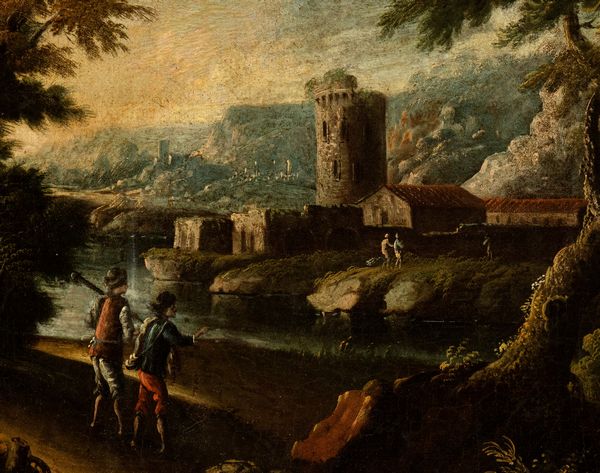Paesaggio con rudere, torre e figure