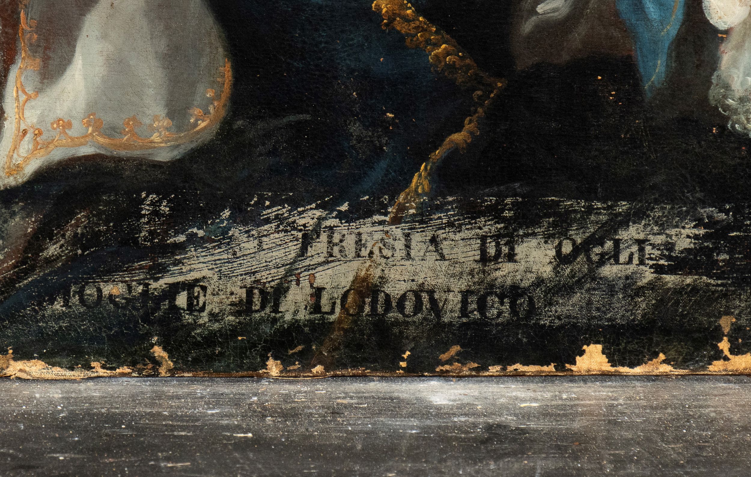 Il dipinto reca iscrizione parzialmente leggibile in basso al centro: 'FRESIA DI OGLI / MOGLIE DI LODOVICO'.
