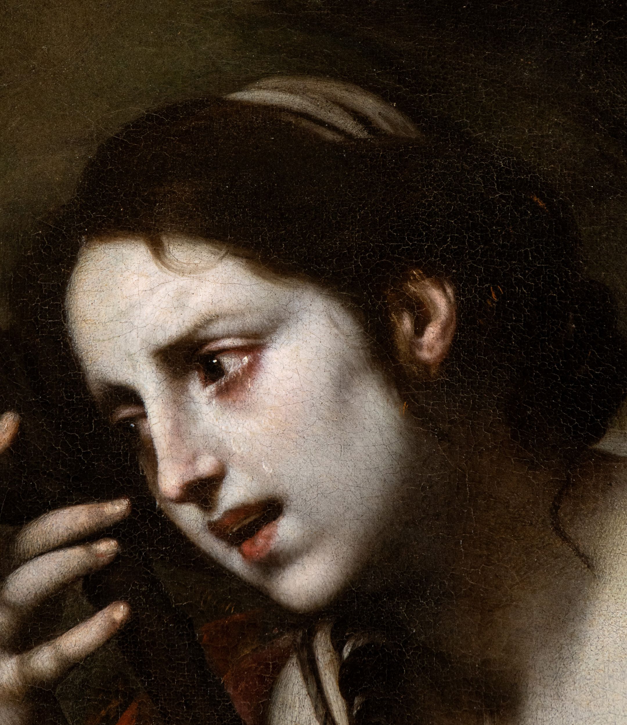 Il dipinto reca sigla a pennello in basso a sinistra: 'FR'. Reso noto da Ferdinando Bologna come indiscutibile dipinto autografo di Pacecco De Rosa, da principio l’iconografia del dipinto fu oggetto di una comprensibile confusione, essendo identificata la santa come Maria Maddalena. In realtà si tratta di Santa Maria Egiziaca, come dimostra l’attributo distintivo delle tre pagnotte, suo unico nutrimento durante la permanenza del deserto e simbolo della sua ascetica rinunzia a ogni bene mondano dopo la conversione seguita a una giovinezza trascorsa come cortigiana in Alessandria d’Egitto. Poche volte, nel pur cospicuo catalogo delle sue opere destinate alla devozione privata, Pacecco de Rosa si mostra così ispirato, in primo luogo dal punto di vista squisitamente pittorico, come in questa mirabile effige di santa penitente. Possiamo qui rilevare agevolmente la vicinanza del suo stile con quello del patrigno, maestro e infine socio Filippo Vitale, ma anche le tangibili relazioni formali con altri protagonisti della pittura napoletana post-caravaggesca come Massimo Stanzione, Andrea Vaccaro, Giuseppe di Guido (già Maestro di Fontanarosa) e Francesco Guarino. La santa è raffigurata in uno strettissimo primo piano, che conferisce massimo rilievo alle presenze simboliche dei pani e della croce e permette la più intensa concentrazione sul volto estatico, con le lacrime che le solcano le guance in un vortice di pathos mistico che amplifica l’effetto dell’immagine e il coinvolgimento emotivo dello spettatore. Senz’altro da accogliere la datazione fissata per l’opera da Vincenzo Pacelli fra il 1640 e il 1645, nella piena maturità dell’autore, in prossimità di altri capolavori di Pacecco come l’Agar del Museo de Arte di Ponce (Puerto Rico), la Flora del Kunsthistorisches Museum di Vienna, la Santa Dorotea della Narodni Galerie di Praga e la Sacra Famiglia già nella galleria antiquaria Toto a Bari.