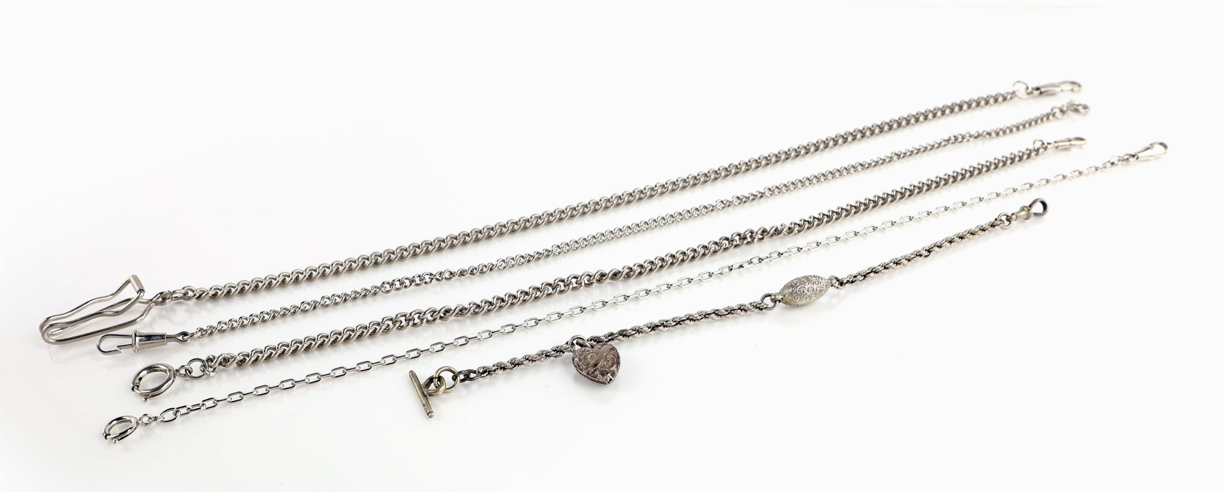 5 catene da orologio in metallo argentato, acciaio e metallo cromato. Una con ciondolo [..]