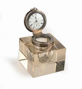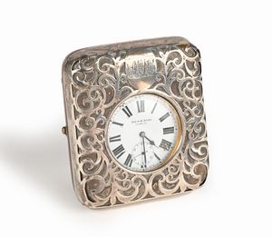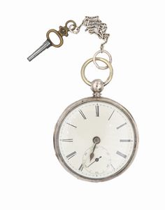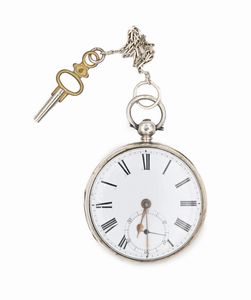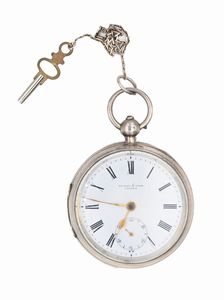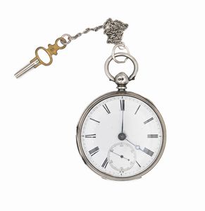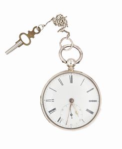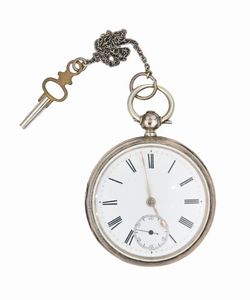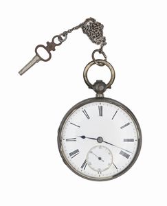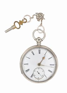 diam mm 39 1880 circa Funzionante. Meccanismo firmato, cassa e parapolvere numerate 11649. Catena in metallo con [..]