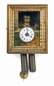 cm 31,5x26x13,5 (la cassa) quadrante dipinto raffigurante due cani alla finestra di cui uno con occhi in movimento; [..]