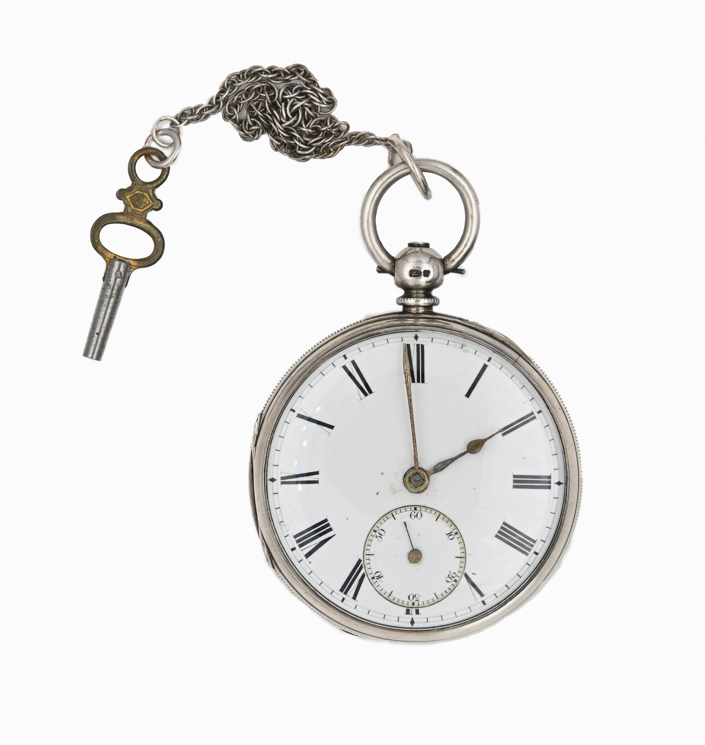 1870 circa Funzionante. Meccanismo firmato e numerato 1287. Parapolvere in ottone. Catena in metallo con chiavetta