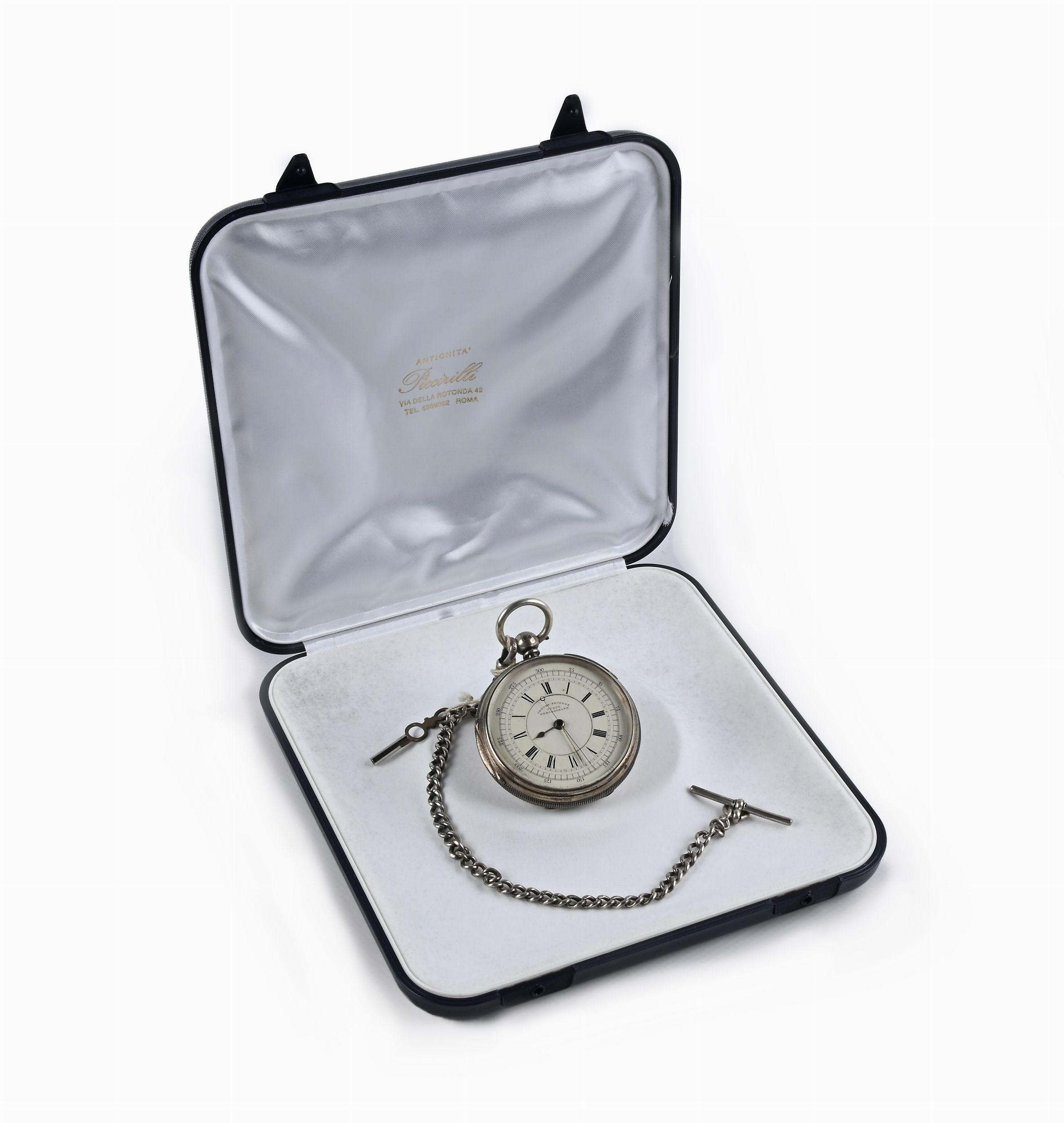 diam mm 59. Catena lunghezza cm 26 1880 circa Funzionante. Meccanismo firmato. Quadrante, cassa, controcassa parapolvere e meccanismo nr 22428. Cassa con punzoni Londra 1882.
