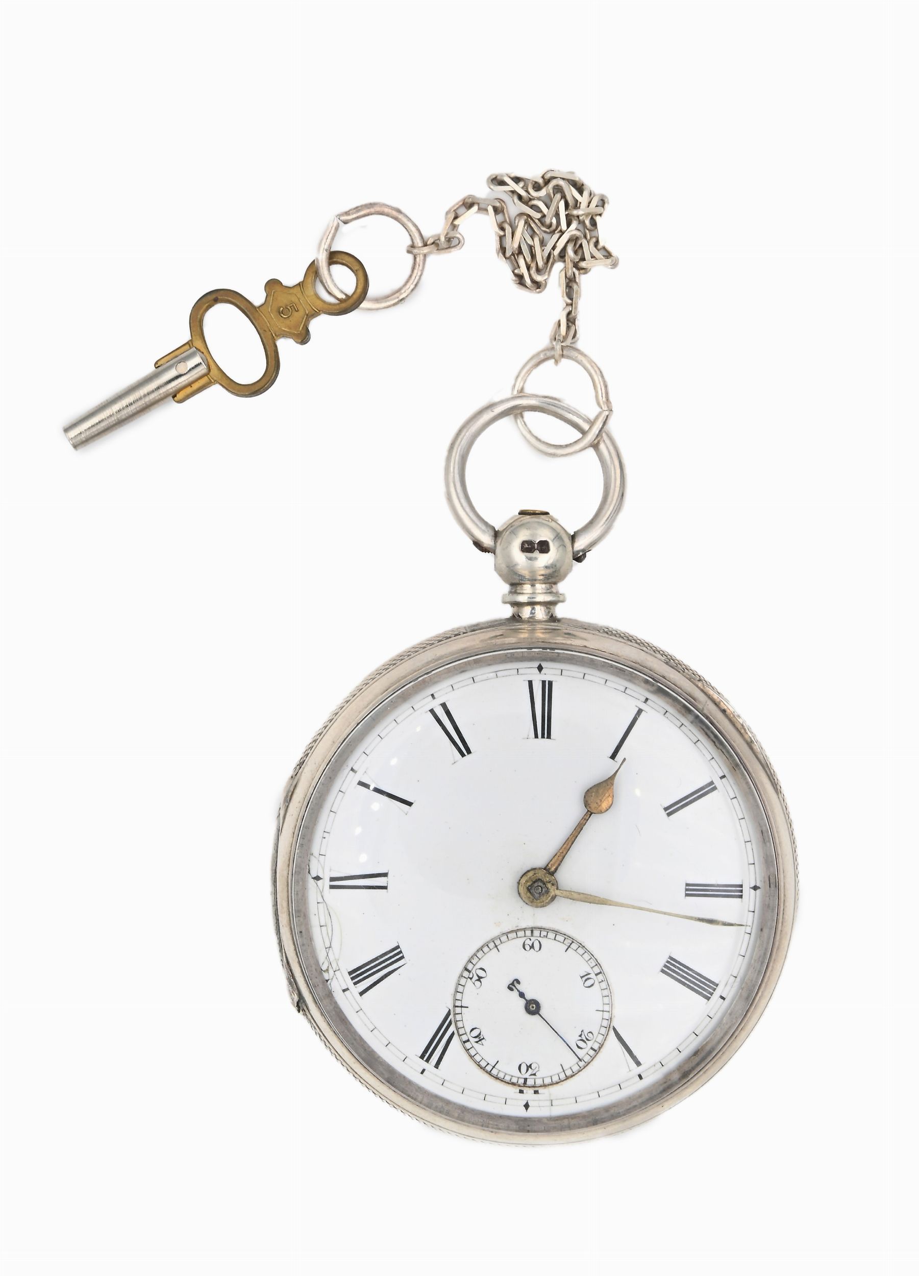 1870 circa Funzionante. Casse numerate 741, meccanismo numerato 56741. Parapolvere in ottone. Catena in metallo e chiavetta