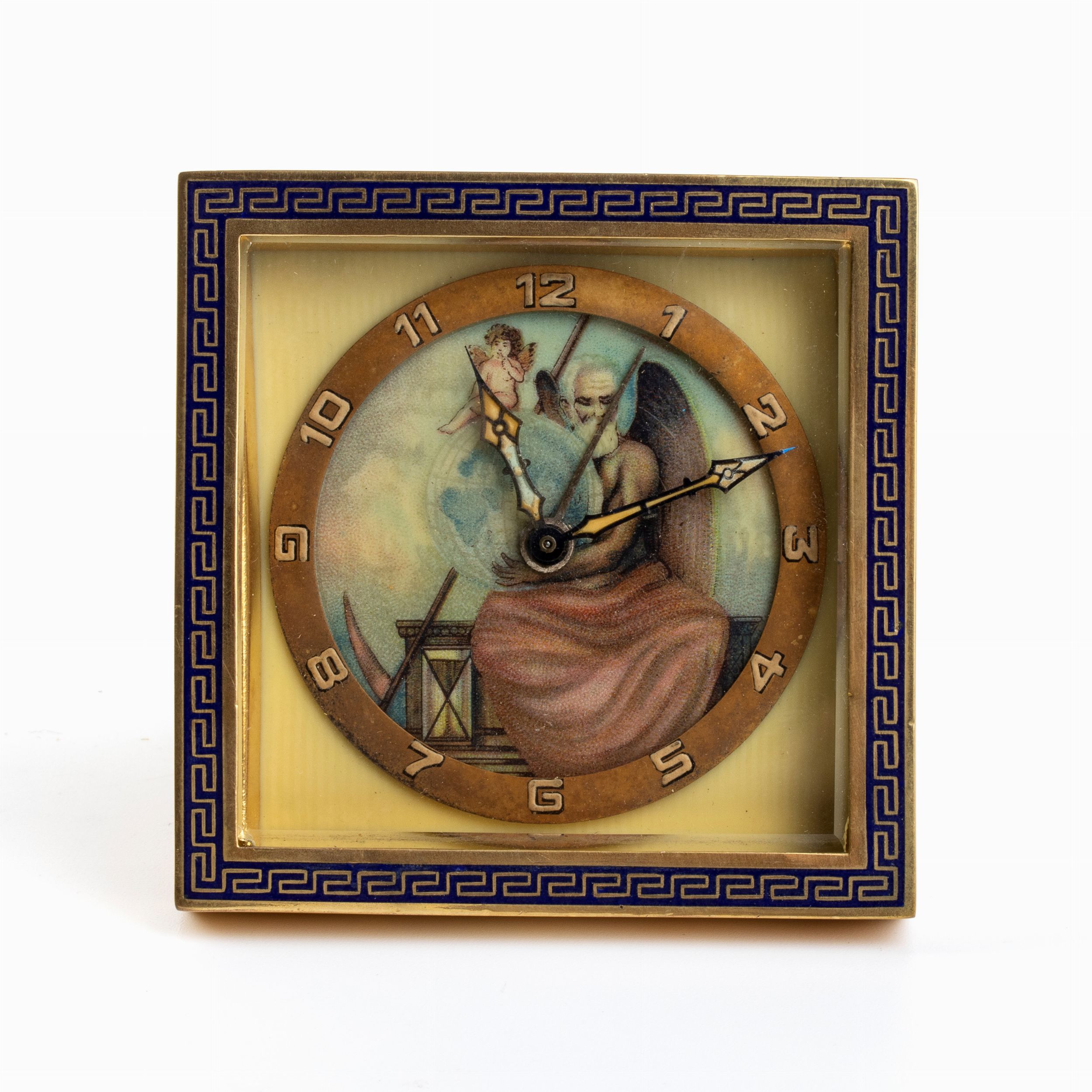 Altezza x larghezza x profonditŕ: 7,7 x 7,7 x 3 cm. Peso 294,5 gr. Anni '20 - '30 cassa quadrata in ottone con cornice perimetrale in smalti nei toni del blu, quadrante dipinto in policromia con la raffigurazione di Krono con falce, clessidra, sfera armillare, lunetta dorata e numeri arabi. Padre Crono, conosciuto anche come Padre Tempo è la personificazione del tempo. Numeri Arabi e sfere luminescenti. Classificazione dello stato di conservazione: **** buono. La cassa dell’orologio è in un buono stato di conservazione con le normali usure e difetti commensurati all’epoca e all’uso nel tempo. Il movimento dell’orologio è attualmente funzionante ma potrebbe necessitare di una verifica tecnica.