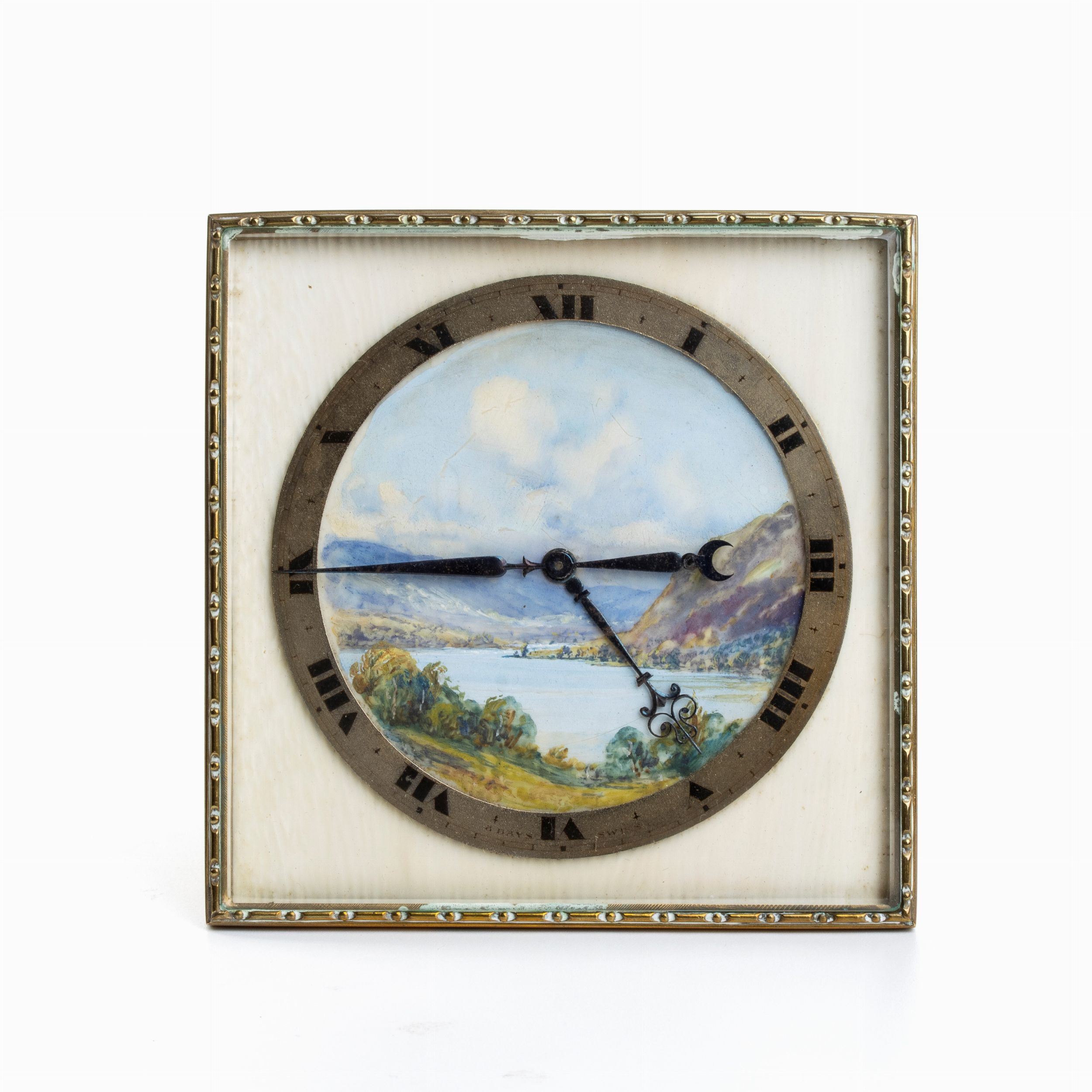 Altezza x larghezza x profonditŕ: 10,2 x 10,2 x 1,8 cm. Peso 331,7 gr. Anni '20 - '30 cassa quadrata in ottone; orologio con cornice in avorio di elefante (Elephas maximus Linnaeus, 1758 or Loxodonta africana Blumenbach, 1797) , quadrante dipinto con un paesaggio fluviale con lunetta dorata e numeri romani con iscrizione ' 8 Days - Swiss'. Classificazione dello stato di conservazione: **** buono. La cassa dell’orologio è in un buono stato di conservazione con le normali usure e difetti commensurati all’epoca e all’uso nel tempo. Il movimento dell’orologio è attualmente funzionante ma potrebbe necessitare di una verifica tecnica.