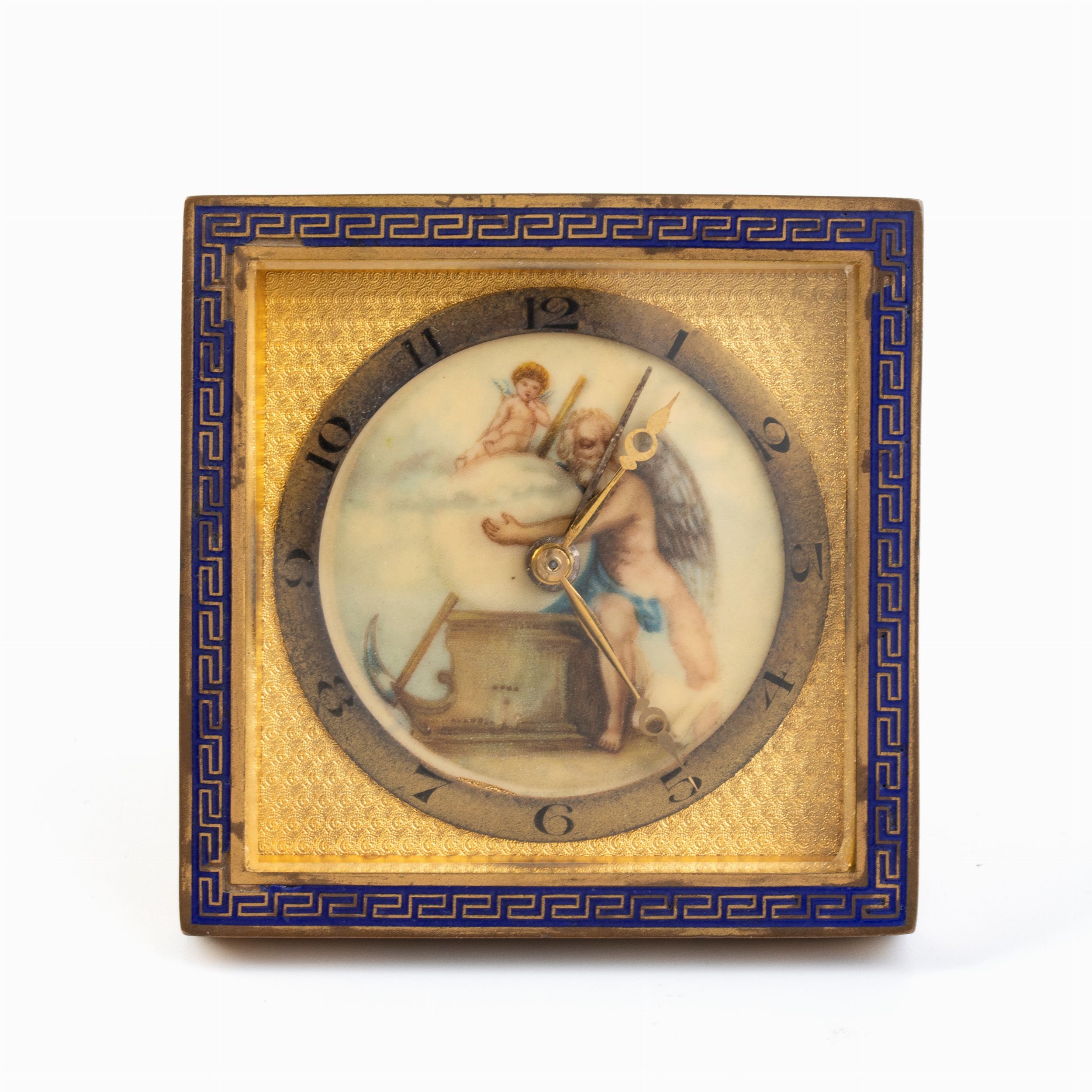 Altezza x larghezza x profonditŕ: 7,7 x 7,7 x 3 cm. Peso 290 gr. Anni '20 - '30 cassa quadrata in ottone con cornice perimetrale in smalti nei toni del blu, quadrante dipinto in policromia con la raffigurazione di Krono con falce, clessidrae sfera armillare, lunetta dorata e numeri arabi. Padre Crono, conosciuto anche come Padre Tempo è la personificazione del tempo. Classificazione dello stato di conservazione: **** buono. La cassa dell’orologio è in un buono stato di conservazione con le normali usure e difetti commensurati all’epoca e all’uso nel tempo. Il movimento dell’orologio è attualmente funzionante ma potrebbe necessitare di una verifica tecnica.