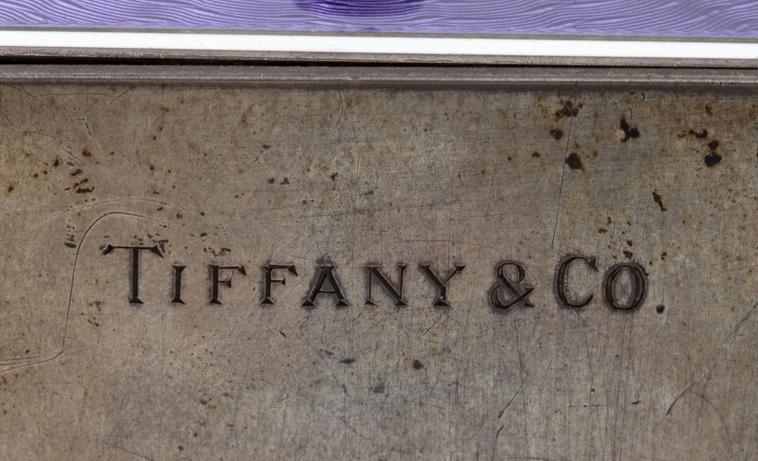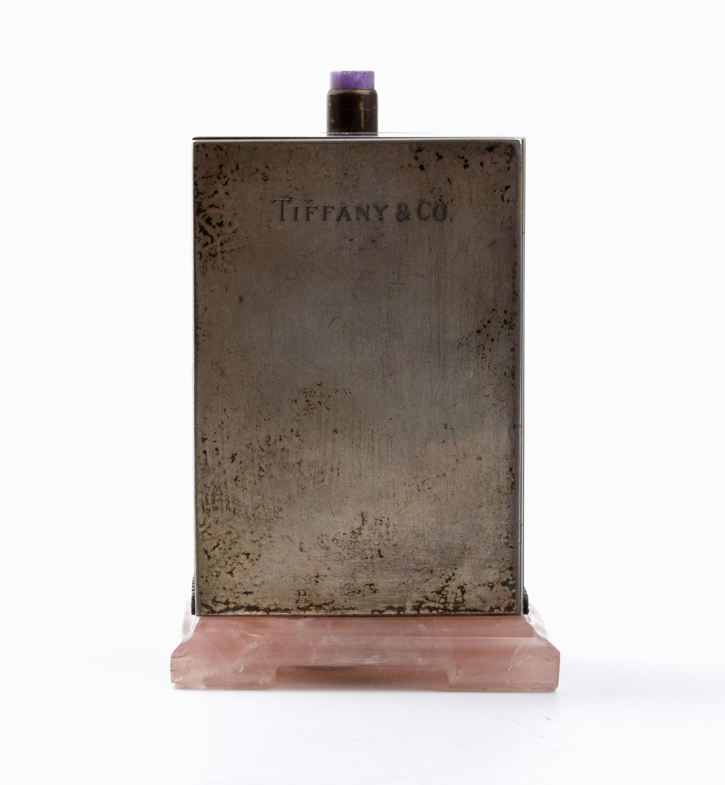 Anni' 20 - '30 Cassa di forma rettangolare in argento 935/1000 con smalti guilloché nei toni del viola con cornici in smalto bianco poggiante su un basamento in quarzo rosa. Quadrante in smalti guilloché viola con lunetta delle ore dorata, numeri arabi e sfere nere. Movimento con ripetizione delle ore, dei quarti e dei minuti. Firmato 'E. Mathey Tissot & Co. Switzerland - Fifteen 15 Jewels - Three Adj - 7319'. Carica e rimessa delle ore a chiave. Cassa punzonata esternamente 'Tiffany & Co.'. All'interno della cassa 'E. Mathey Tissot & Co. Switzerland', 'Argent - 0,935 - Sterling' e la dedica 'Mrs Frank Barackes - Chicago, Illinois'. Tissot & Co., fondata nel 1853 da Charles-Félicien Tissot e suo figlio Charles-Émile Tissot a Le Locle, Svizzera, è un rinomato orologiaio svizzero. La loro collaborazione con Tiffany & Co. ha combinato l'esperienza orologiera svizzera con il prestigioso marchio di lusso di Tiffany. Classificazione dello stato di conservazione: **** buono. La cassa dell’orologio è in un buono stato di conservazione con le normali usure e difetti commensurati all’epoca e all’uso nel tempo; minori difetti agli smalti e al quadrante. Il movimento dell’orologio è attualmente funzionante ma potrebbe necessitare di una verifica tecnica.