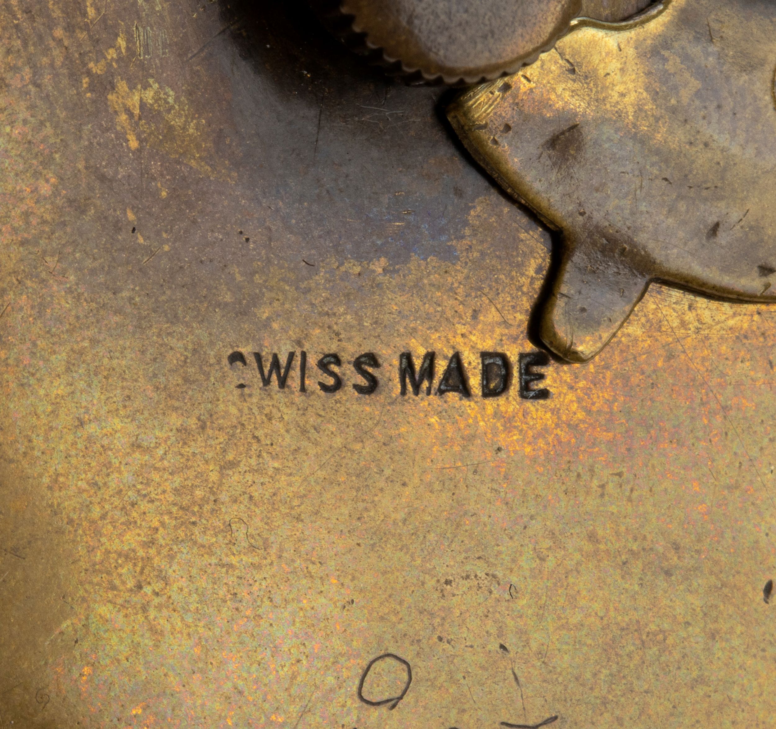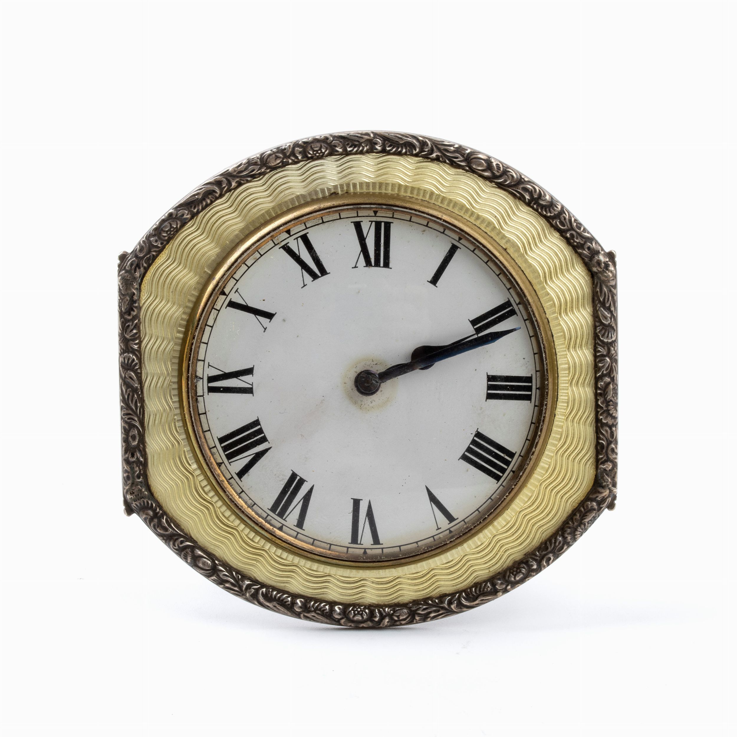 Altezza x larghezza x profonditŕ: 8,1 x 8,1 x 1,6 cm. Peso: 190 gr. Anni '20 - '30 Cassa rotonda in metallo e smalti guilloché nei toni del giallo, quadrante in smalto bianco con numeri romani e sfere nere. Nella parte posteriore l'iscrizione 'Swiss made'. Classificazione dello stato di conservazione: **** buono. La cassa dell’orologio è in un buono stato di conservazione con le normali usure e difetti commensurati all’epoca e all’uso nel tempo. Il movimento dell’orologio è attualmente funzionante ma potrebbe necessitare di una verifica tecnica.