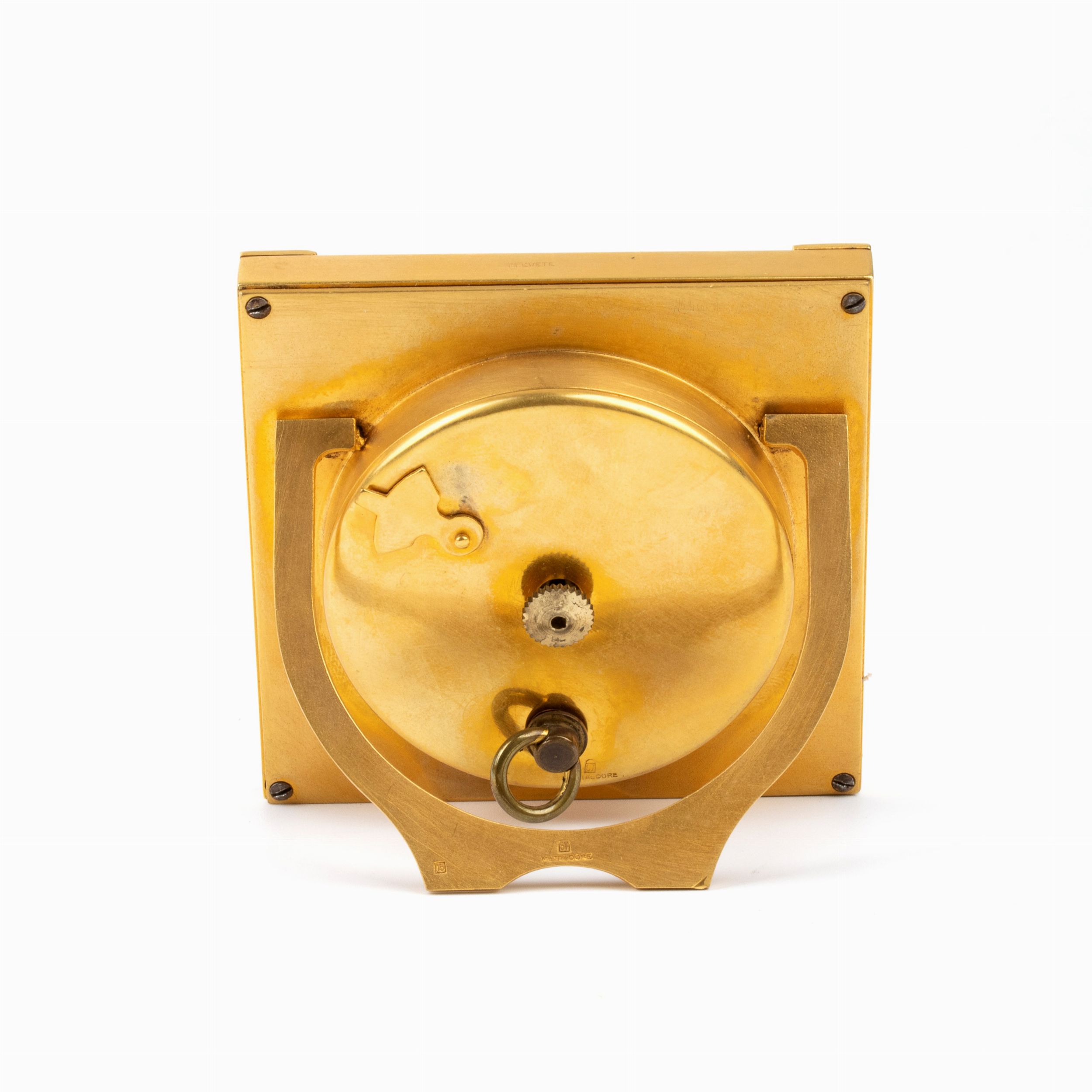 Altezza x larghezza x profonditŕ: 6,9 x 6,9 x 1,8 cm. Peso: 216,4 gr. Anni '20 - '30 Cassa di forma quadrata con smalti perimetrali beige, quadrante in smalto guilloché nei toni del blu con decori floreali, numeri arabi e sfere luminescenti riportante l'iscrizione '8 days'. Sul bordo esterno 'BREVETE', sul cavalletto 'METAL DORE - SV - 15'. Classificazione dello stato di conservazione: **** buono. La cassa dell’orologio è in un buono stato di conservazione con le normali usure e difetti commensurati all’epoca e all’uso nel tempo. Il movimento dell’orologio è attualmente funzionante ma potrebbe necessitare di una verifica tecnica.