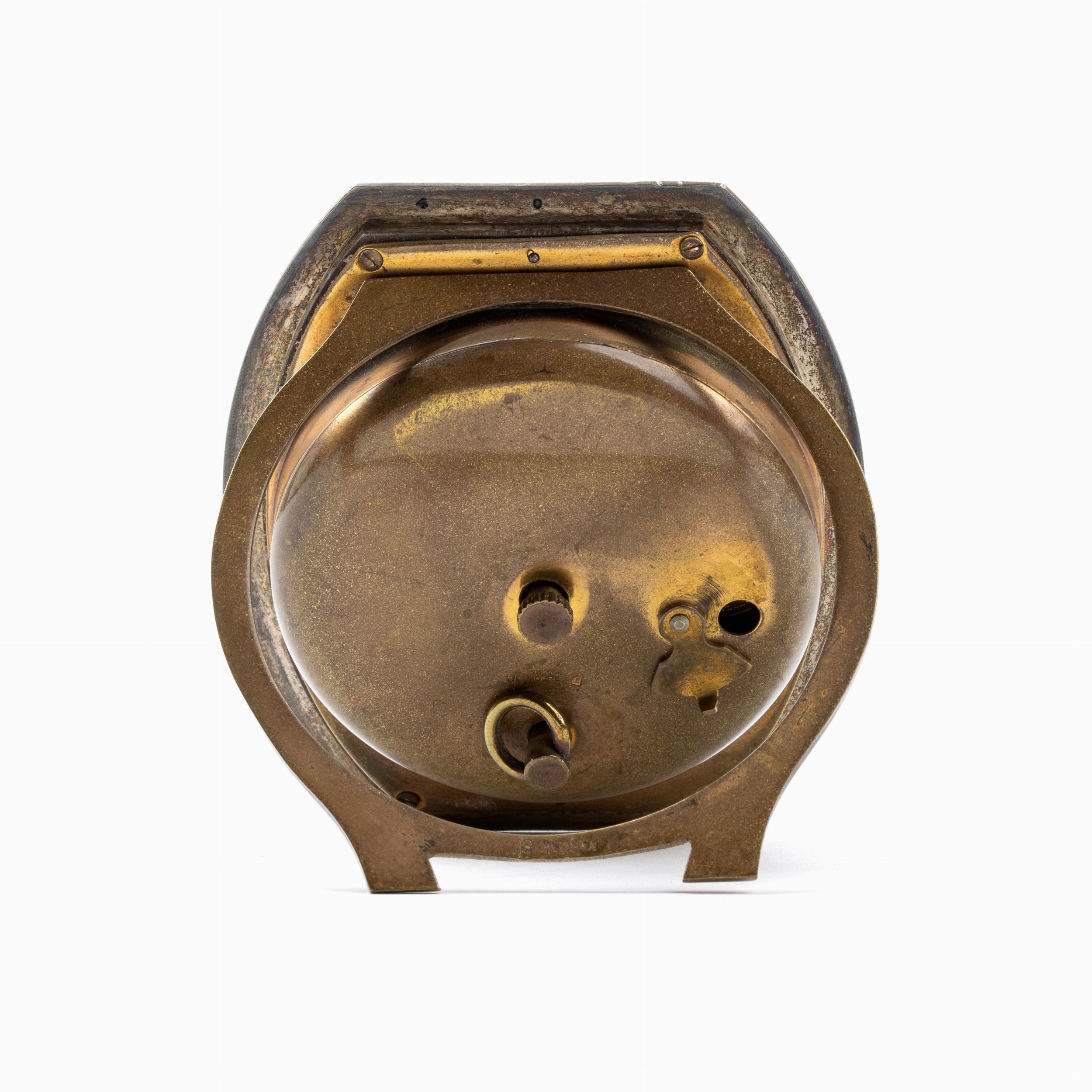 Altezza x larghezza x profonditŕ: 8,3 x 7,1 x 1,8 cm. Peso: 225,5 gr. Francia, anni '30 Cassa ovale in ottone decorata perimetralmente con smalti guilloché nei toni dell'azzurro, quadrante dorato con numeri arabi e sfere luminescenti riportante le iscrizioni '8 Days - Swiss made'. Nella parte interna del cavalletto le iscrizioni 'C.H - Depose - 259 - France'. Classificazione dello stato di conservazione: **** buono. La cassa dell’orologio è in un buono stato di conservazione con le normali usure e difetti commensurati all’epoca e all’uso nel tempo. Il movimento dell’orologio è attualmente funzionante ma potrebbe necessitare di una verifica tecnica.