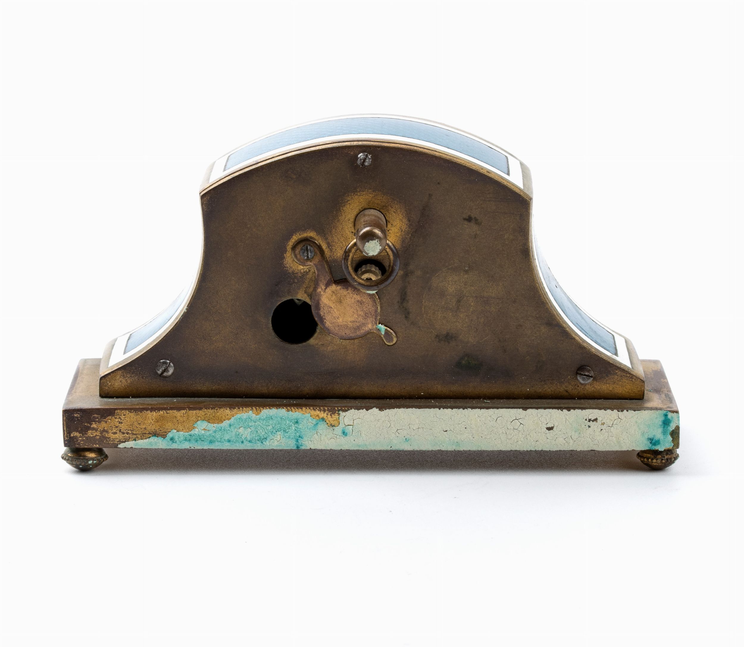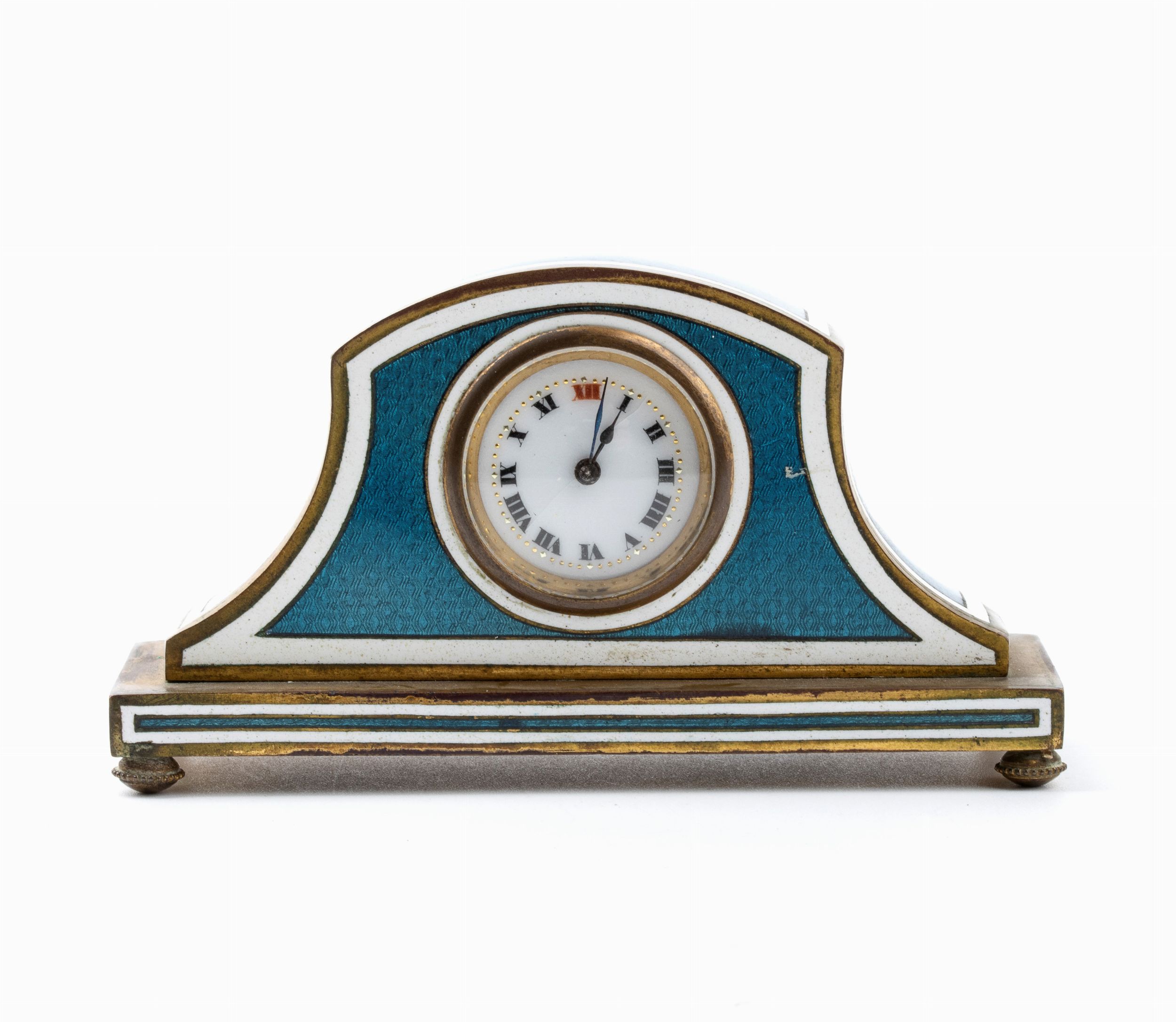 Altezza x larghezza x profonditŕ: 5 x 9,2 x 3,2 cm. Peso: 189,1 gr. Anni '20 - '30 Cassa sagomata in metallo dorato con smalti guilloché nei toni del blu con cornici bianche, quadrante in smalto bianco con numeri romani, entro riserve in smalto bianco e sfere dorate. Classificazione dello stato di conservazione: **** buono. La cassa dell’orologio è in un buono stato di conservazione con le normali usure e difetti commensurati all’epoca e all’uso nel tempo. Il movimento dell’orologio necessita di una verifica tecnica.