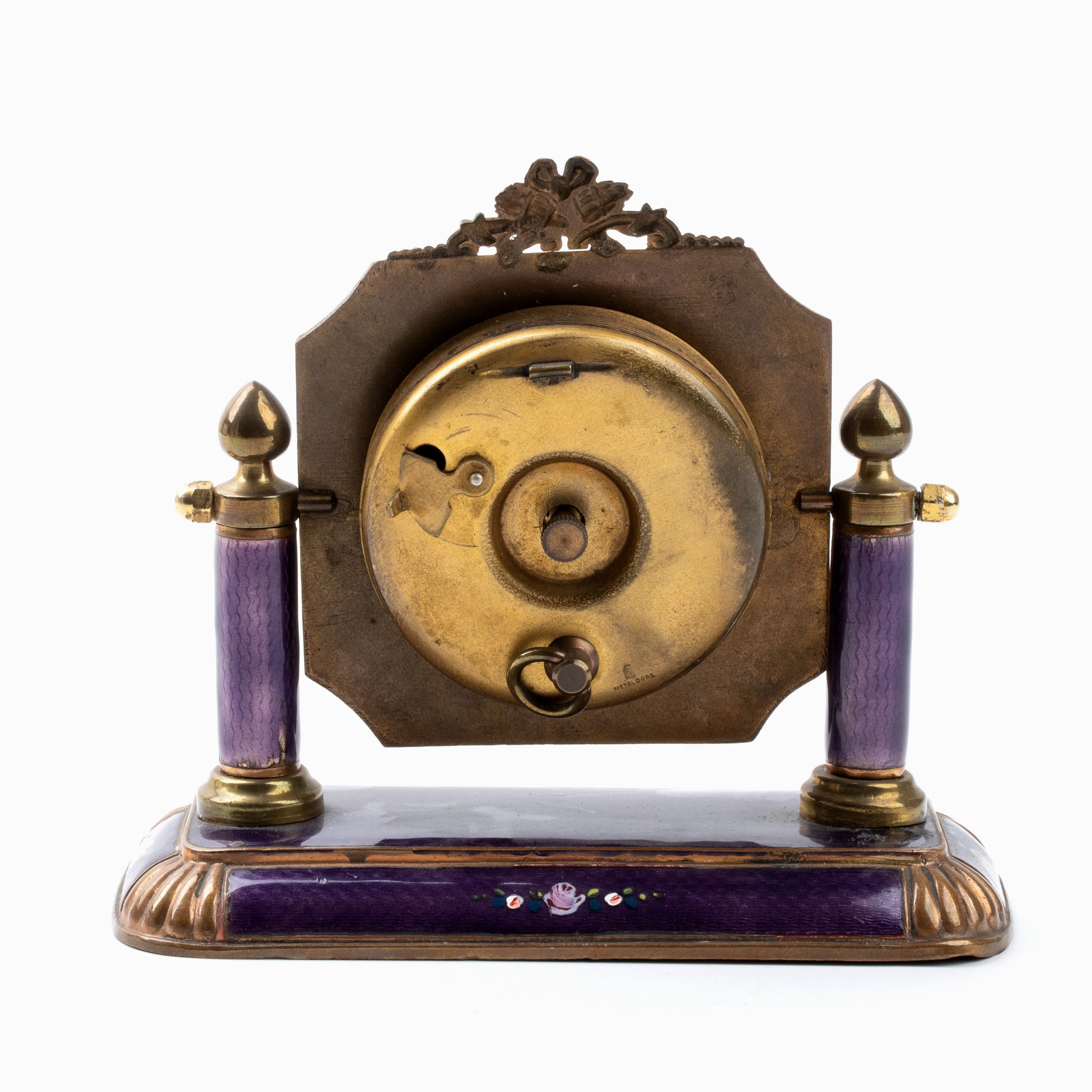 Altezza x larghezza x profonditŕ: 10,2 x 11,5 x 5,3 cm. Peso: 242,5 gr. Anni '20 - '30 Cassa metallo dorato con smalti guilloché nei toni del viola con decori floreali policromi poggiante su basamento basculante, quadrante dorato con numeri arabi e sfere dorate riportante le iscrizioni '8 Days - Swiss made'. Classificazione dello stato di conservazione: **** buono. La cassa dell’orologio è in un buono stato di conservazione con le normali usure e difetti commensurati all’epoca e all’uso nel tempo. Il movimento dell’orologio necessita di una verifica tecnica.