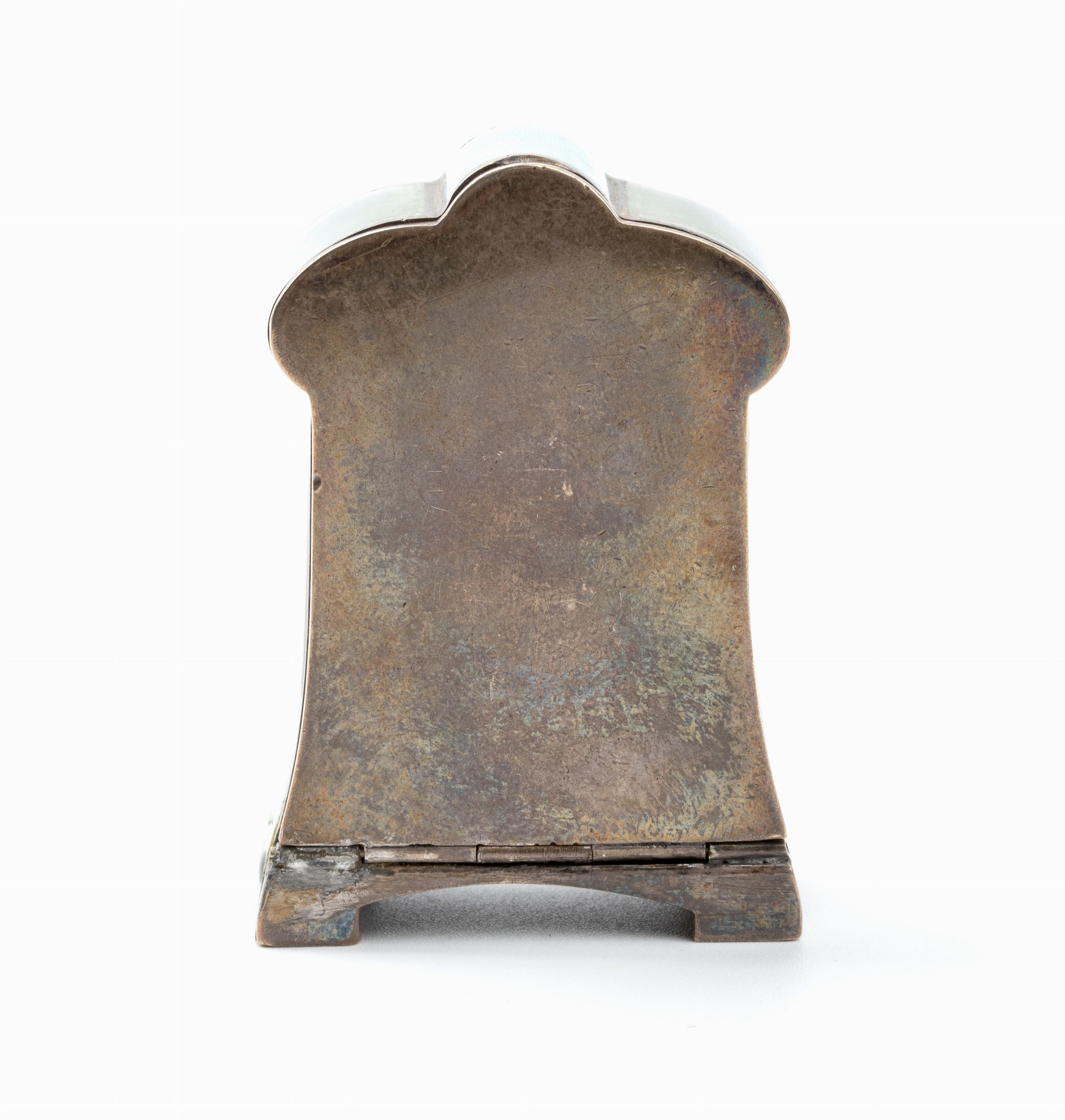 Altezza x larghezza x profonditŕ: 5,3 x 3,7 x 2,1 cm. Peso: 85,4 gr. Svizzera, anni '20 - '30 Cassa sagomata in argento 935/1000 e smalti guilloché nei toni del verde e dell'azzurro, quadrante in smalto bianco con numeri arabi e sfere dorate. Rimessa delle ore e carica a chiave. Punzonato nella parte sottostante con i marchi per l'argento 935/1000 in uso in svizzera dal 1882 al 1934 e con le iscrizioni 'Argent - Sterling silver - 0,935 - n. 5308'. All'interno dello sportellino posteriore ' Swiss Made - 5308' e marchi del titolo. Classificazione dello stato di conservazione: **** buono. La cassa dell’orologio è in un buono stato di conservazione con le normali usure e difetti commensurati all’epoca e all’uso nel tempo. Il movimento dell’orologio necessità di una verifica tecnica.