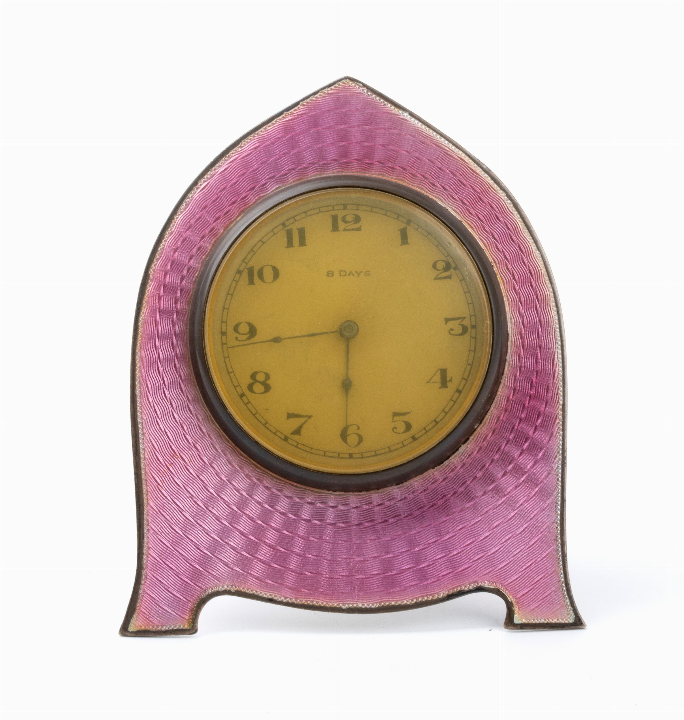 Altezza x larghezza x profonditŕ: 9,8 x 8,1 x 2 cm. Peso: 171,4 gr. Birmingham, 1926 Cassa in argento 925/1000 con smalti guilloché nei toni del rosa, quadrante dorato con numeri arabi e sfere nere riportante l'iscrizione '8 Days'. Punzonato sul bordo con la serie completa di marchi Birmingham 1926-1927, argentiere A Buckley Ltd. A Buckley Ltd. è stata fondata nel 1905 a Birmingham, Inghilterra. Conosciuta per la produzione di argenteria fine e casse per orologi, l'azienda è stata parte della ricca tradizione di argenteria di Birmingham. Ha ottenuto riconoscimento per la sua maestria artigianale durante il primo XX secolo. Classificazione dello stato di conservazione: **** buono. La cassa dell’orologio è in un buono stato di conservazione con le normali usure e difetti commensurati all’epoca e all’uso nel tempo; con leggeri difetti alla cornice in smalto nero. Il movimento dell’orologio necessita di una verifica tecnica; vetro plastica ingiallito.