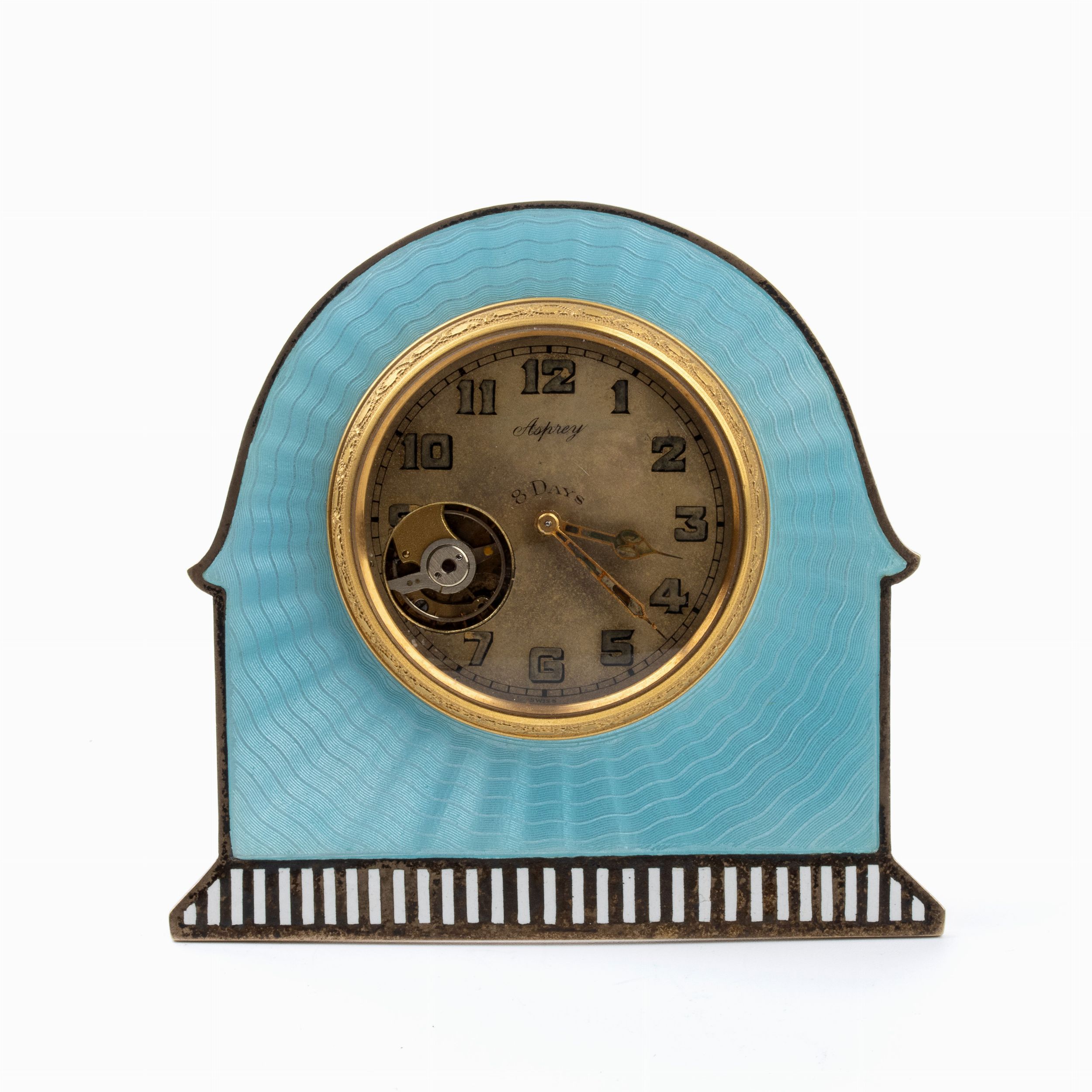 Altezza x larghezza x profonditŕ: 8 x 8,5 x 1,5 cm. Peso: 184,6 gr. Anni '20 - '30 Cassa in metallo dorato con smalti guilloché nei toni dell'azzurro, quadrante dorato con numeri arabi e bilancere a vista riportante le iscrizioni 'Asprey - 8 Days Swiss'. Sul retro '32838 - Metal doré - Cl & Co'. Asprey & Co Ltd è una storica e prestigiosa azienda britannica, rinomata per la sua eccellenza nella gioielleria, argenteria e articoli di lusso. Fondata nel 1781, l'azienda ha una lunga tradizione di alta qualità e innovazione nel design. Classificazione dello stato di conservazione: **** buono. La cassa dell’orologio è in un buono stato di conservazione con le normali usure e difetti commensurati all’epoca e all’uso nel tempo. Il movimento dell’orologio è attualmente funzionante ma potrebbe necessitare di una verifica tecnica.