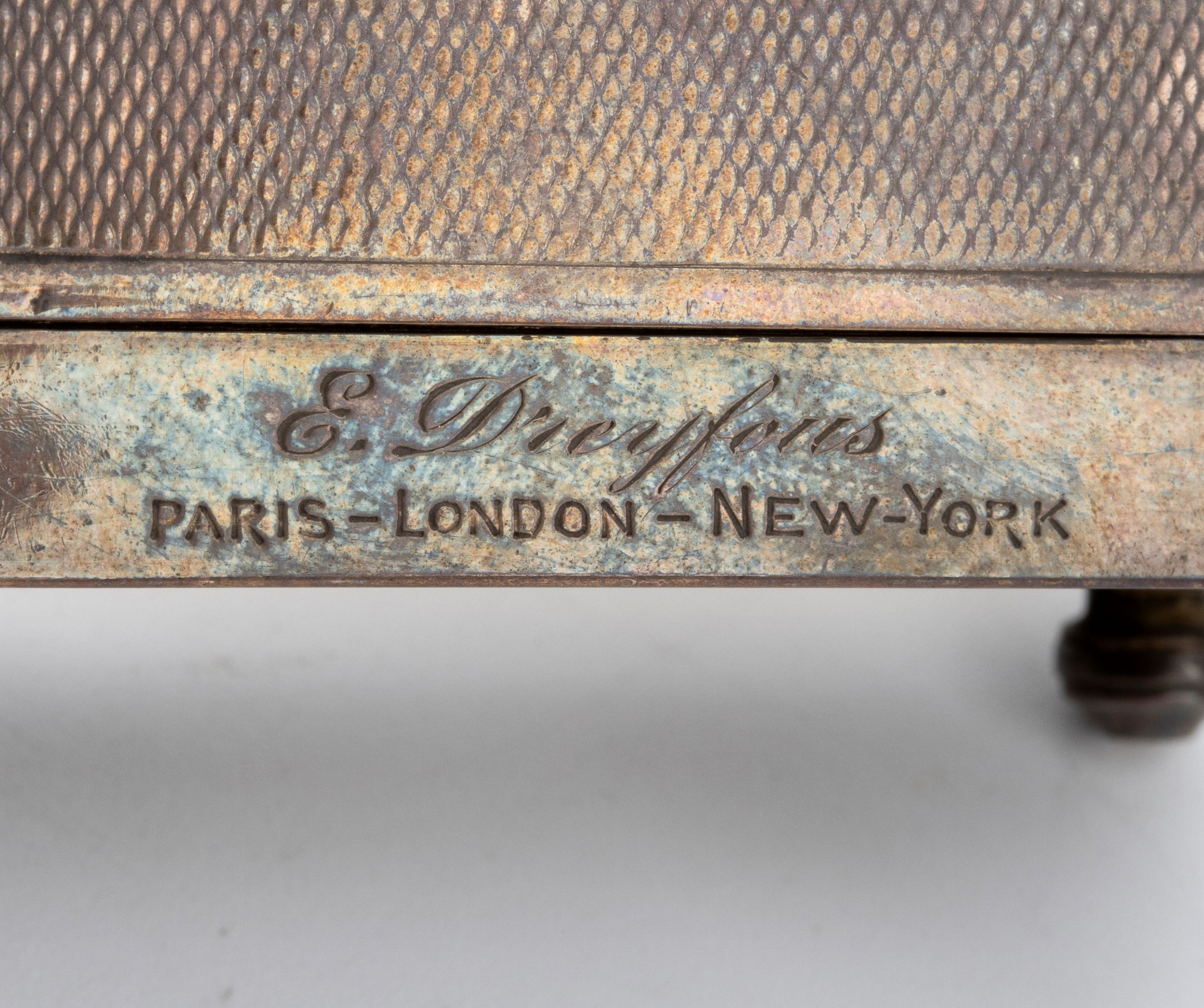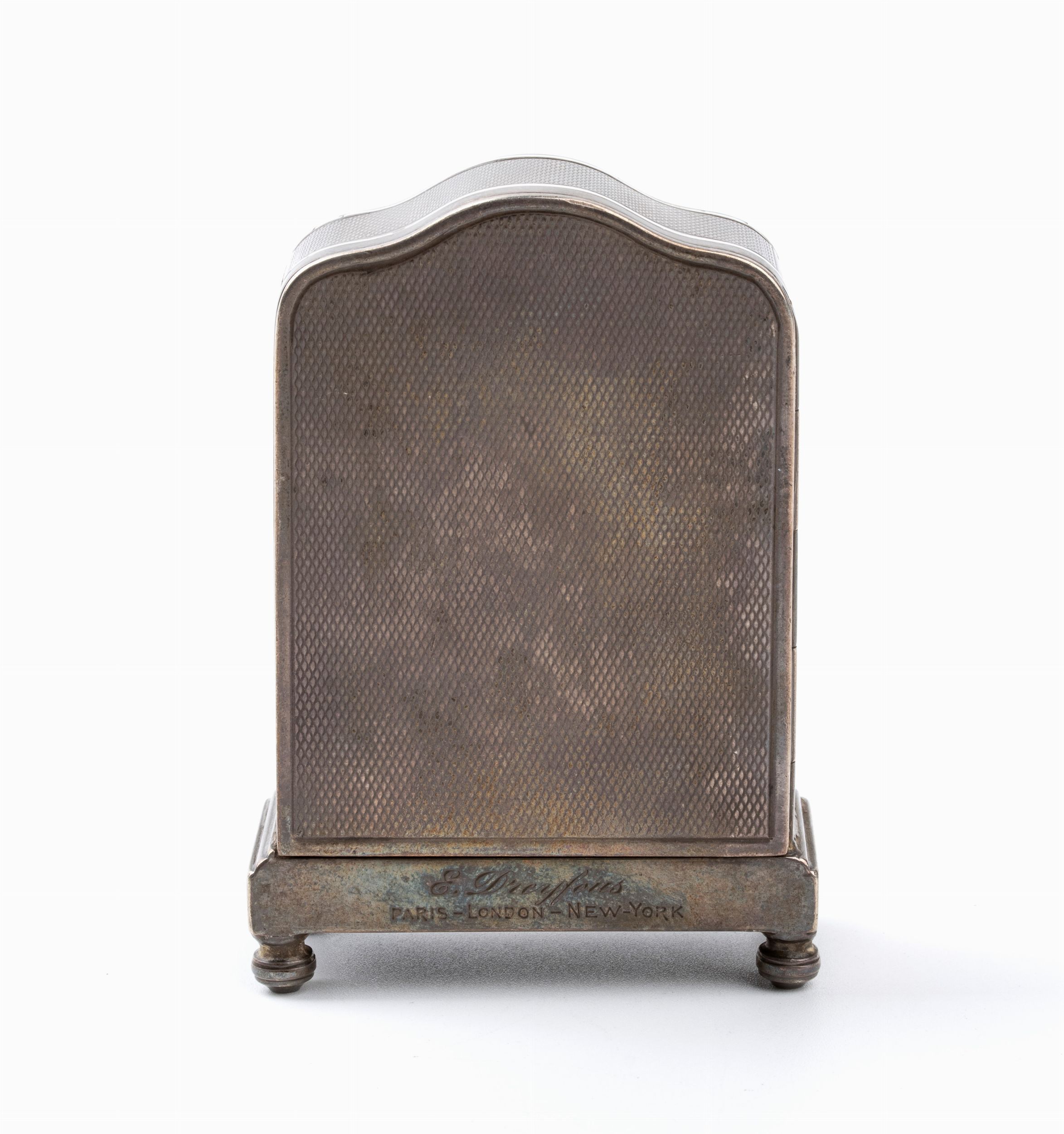Anni '20 - '30 Cassa sagomata in argento e smalti nei toni del bianco con decori dorati, quadrante in smalto guilloché nei toni del viola con numeri romani e sfere dorate. Nella parte posteriore della cassa le iscrizioni 'E. Dreyfous - PARIS - LONDON-NEW-YORK', sul retro del movimento '167699'. Apparentemente non punzonato; testato con acido e pietra di paragone è garantito per essere argento. E. Dreyfous, fondata a Parigi nel 1860, era una rinomata azienda di gioielleria e argenteria. La compagnia era nota per la creazione di pezzi di alta qualità, spesso venduti a una clientela aristocratica e reale, e aveva un negozio situato in Rue de la Paix, una delle vie più prestigiose per il lusso a Parigi. Classificazione dello stato di conservazione: **** buono. La cassa dell’orologio è in un buono stato di conservazione con le normali usure e difetti commensurati all’epoca e all’uso nel tempo; minori difetti agli smalti. Il movimento dell’orologio necessita di una verifica tecnica.