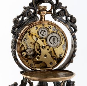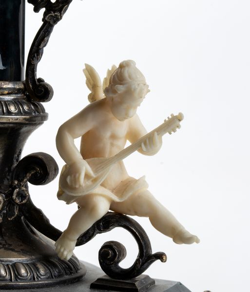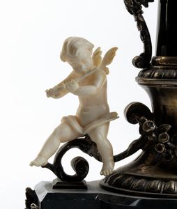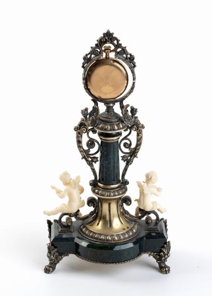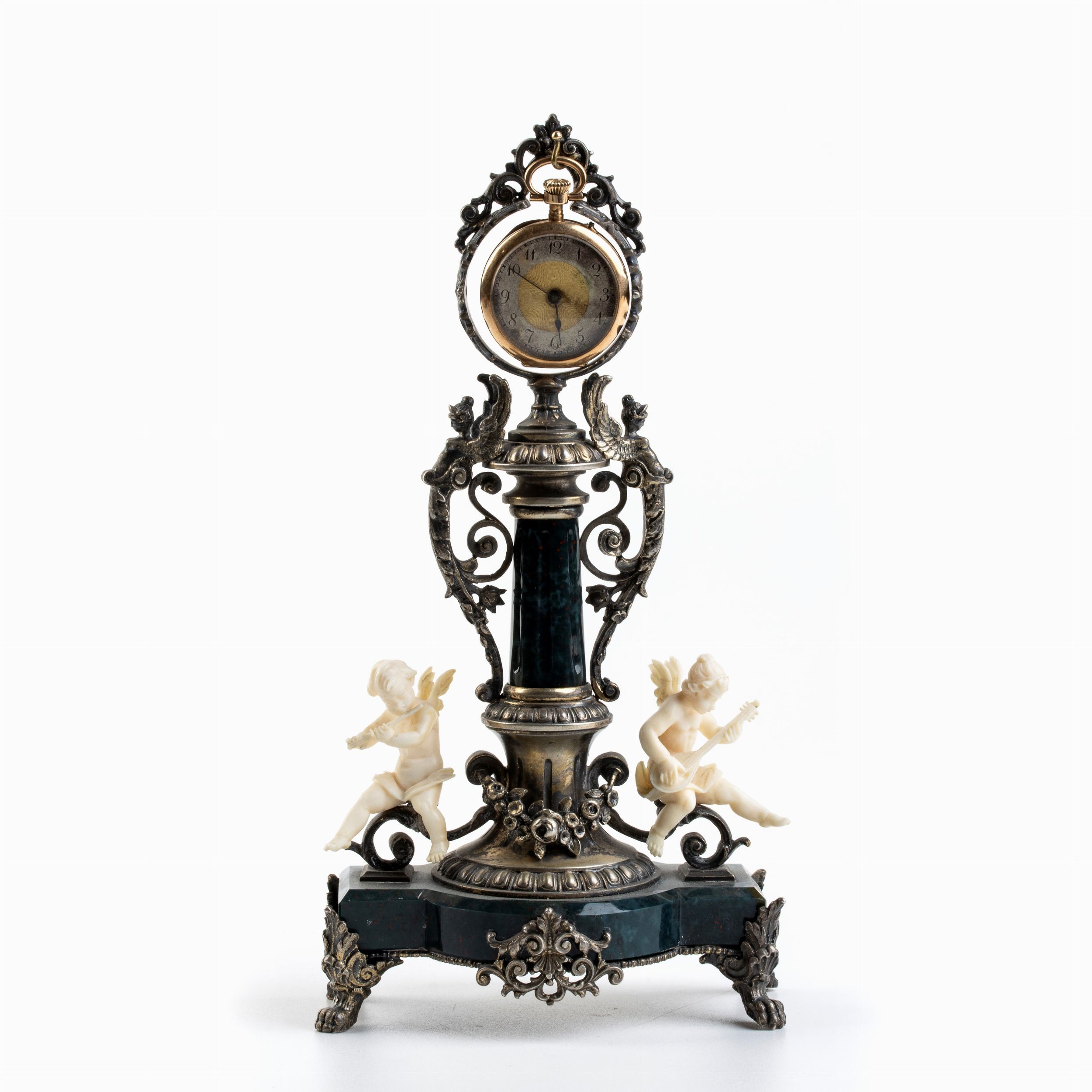 Germania, fine XIX, inizio XX secolo portaorologio in argento parzialmente dorato. Basamento e colonna in diaspro affiancata da due putti musicanti in avorio di elefante scolpito (Elephas maximus Linnaeus, 1758 or Loxodonta africana Blumenbach, 1797).