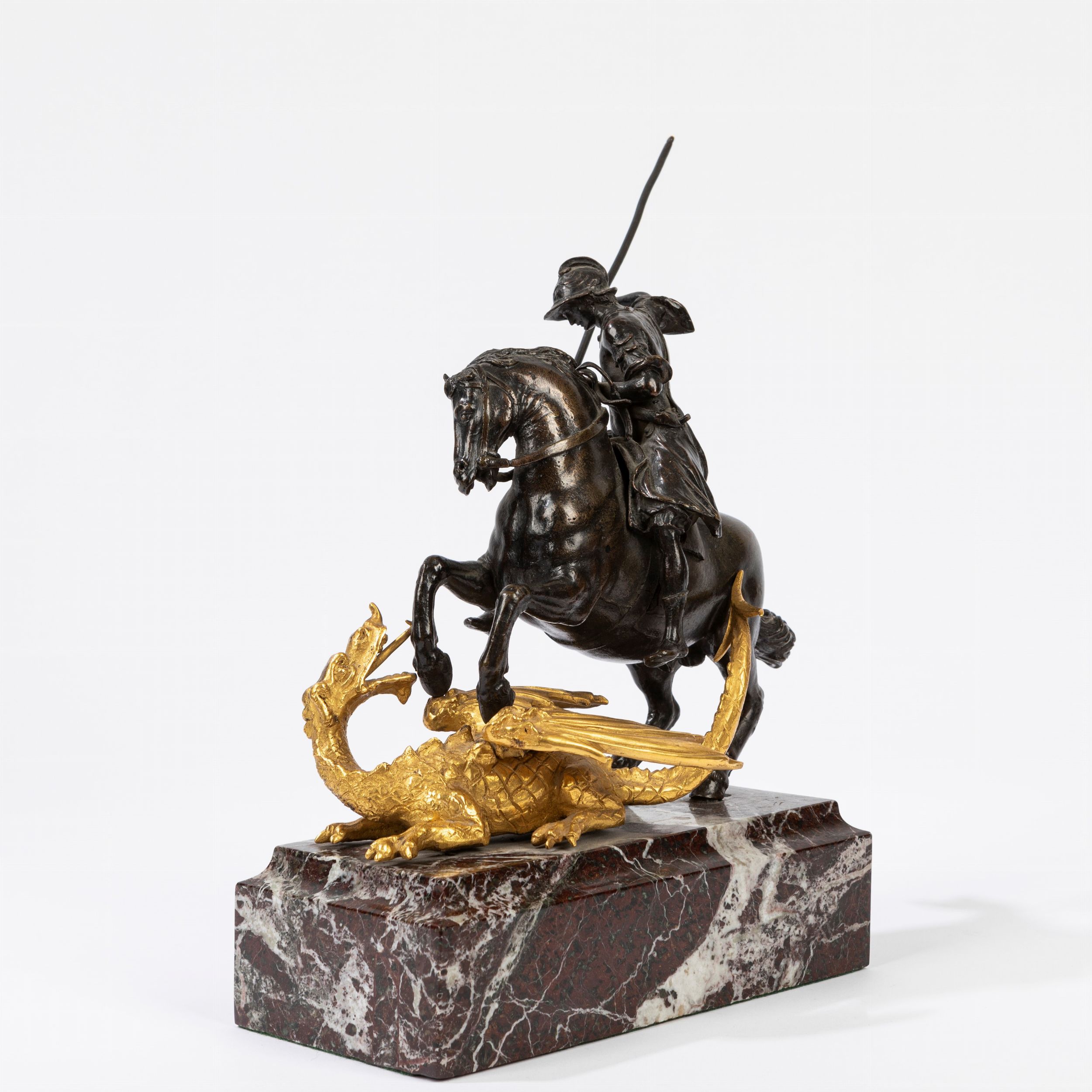 h bronzo cm 24,8; base cm 29,5x10x5,5 Il drago alato in bronzo dorato, intrappolato tra le gambe anteriori del cavallo cavalcato da san Giorgio in bronzo patinato, vestito con abbigliamento militare ed elmetto, pronto ad infilzare il drago con la sua lancia. Il drago possibilmente associato, la base a plinto in marmo di epoca successiva.