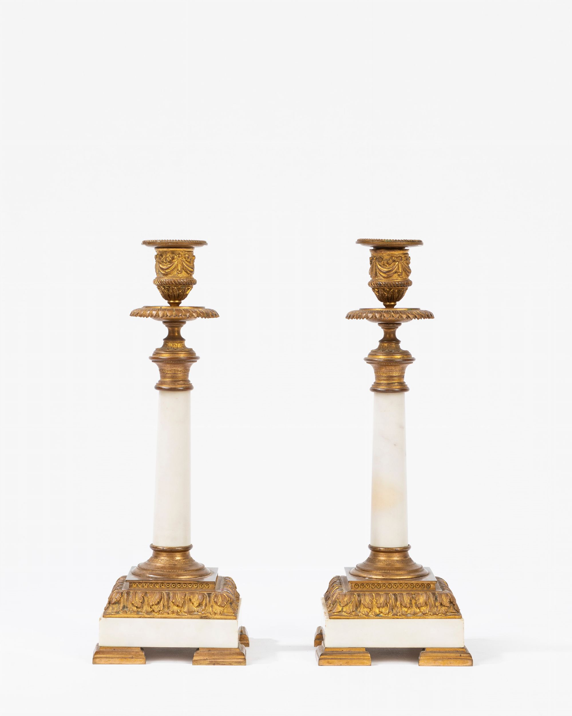 Coppia di candelieri in marmo bianco e metallo dorato