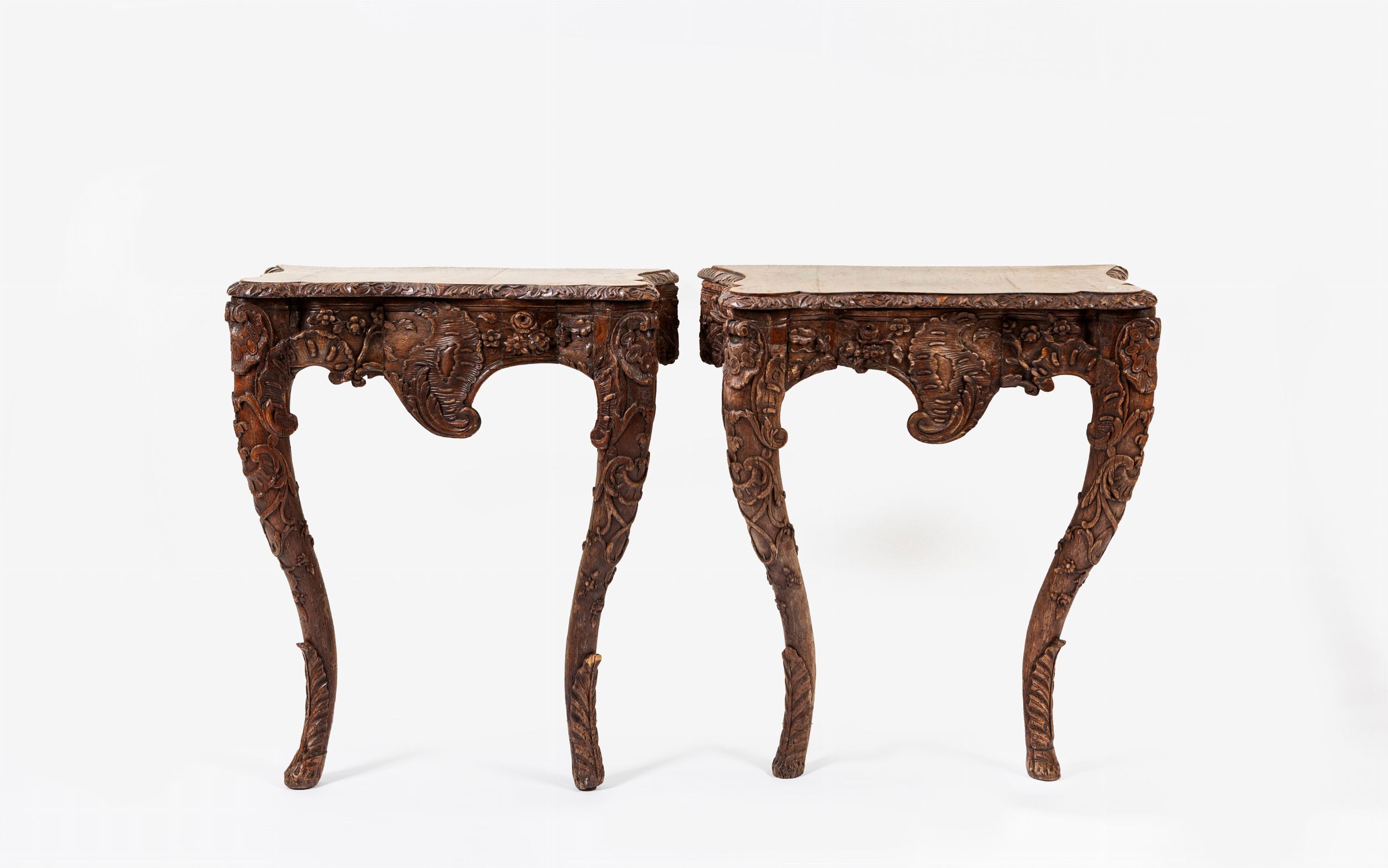 Luigi XV in legno riccamente intagliato a volute e motivi floreali, gambe mosse terminanti con motivo a foglia, piani sagomati, decapate