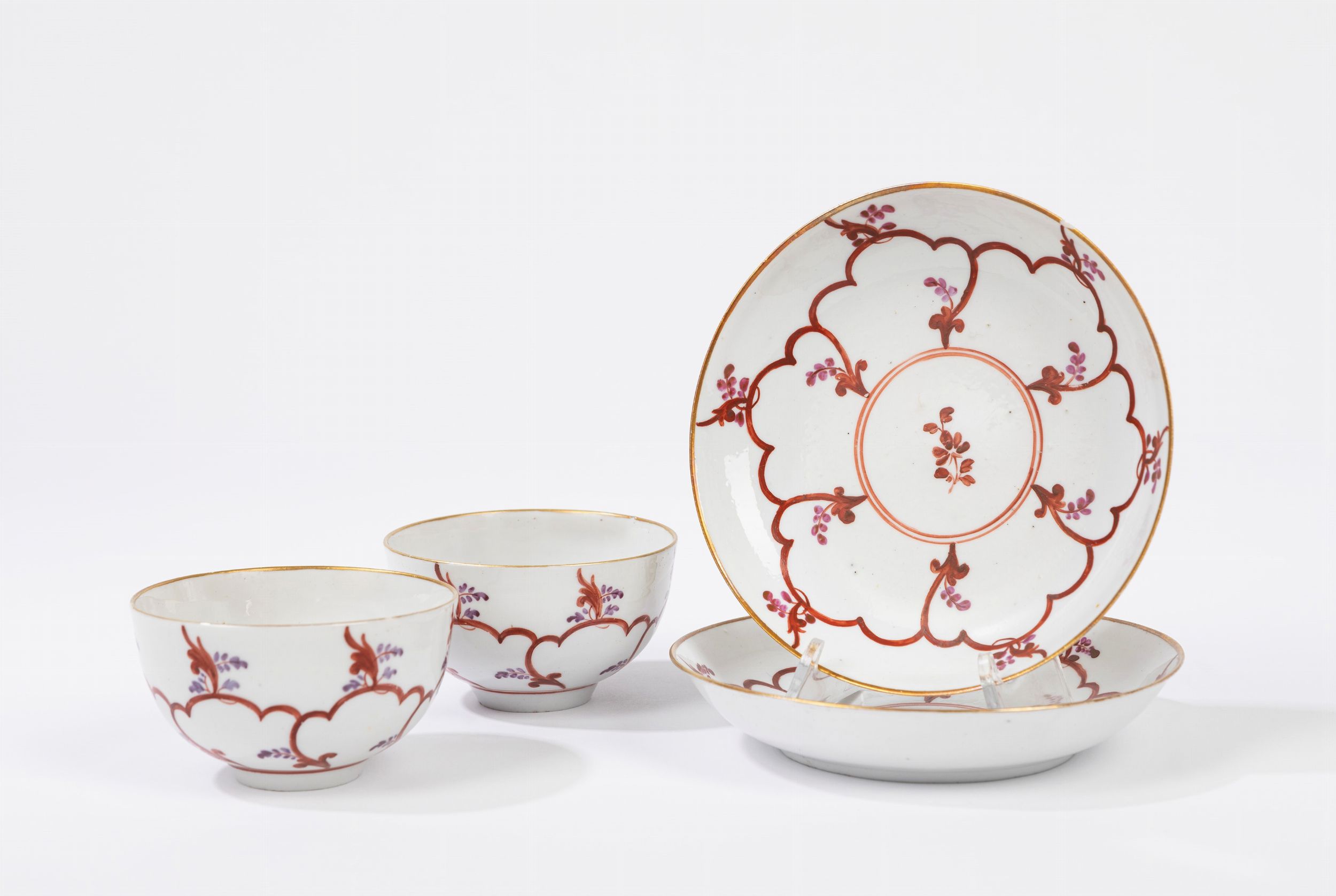 h cm 4,3; d cm 12,5 Venezia, circa 1770 profili dorati, decorate con motivo di origine orientale detto a “feston e cadena” in rosso-ferro con ramoscelli di glicine in porpora , marca di fabbrica sotto le basi (lieve sbeccatura al profilo di un piattino)