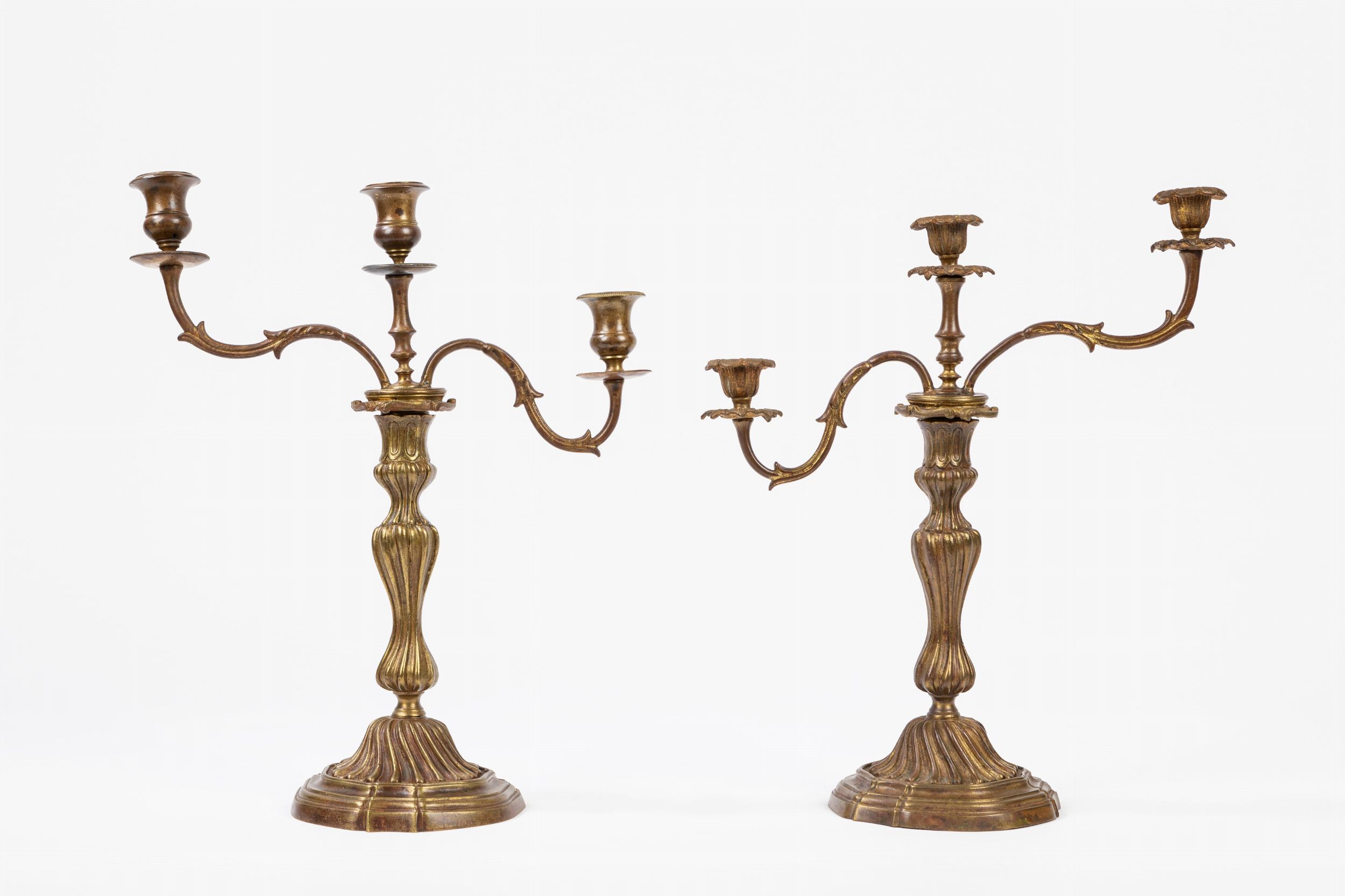 Due antichi candelabri a tre fiamme in metallo brunito