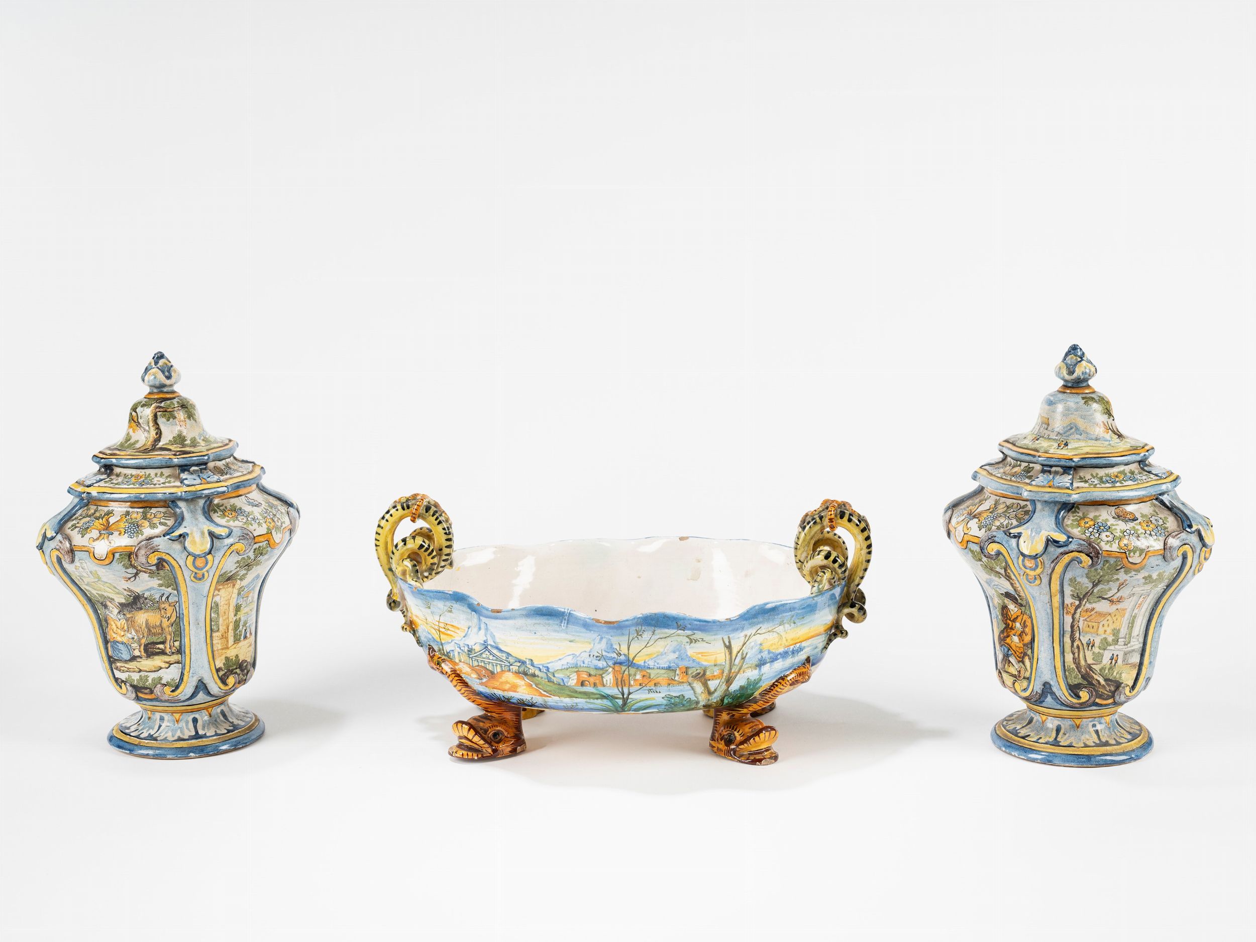 h max cm 30 fine secolo XIX/inizio secolo XX il centrotavola manifattura Cantagalli a profilo mosso, poggiante su quattro piedi a mostri marini, anse a serpenti avviluppati, corpo decorato a paesaggio con gioco di putti, marca alla base (l cm 37x27x18); la coppia di vasi di manifattura dell'Italia meridionale con corpo a balaustro decorato a riserve con scene pastorali, paesaggi, fiori e frutti (difetti)