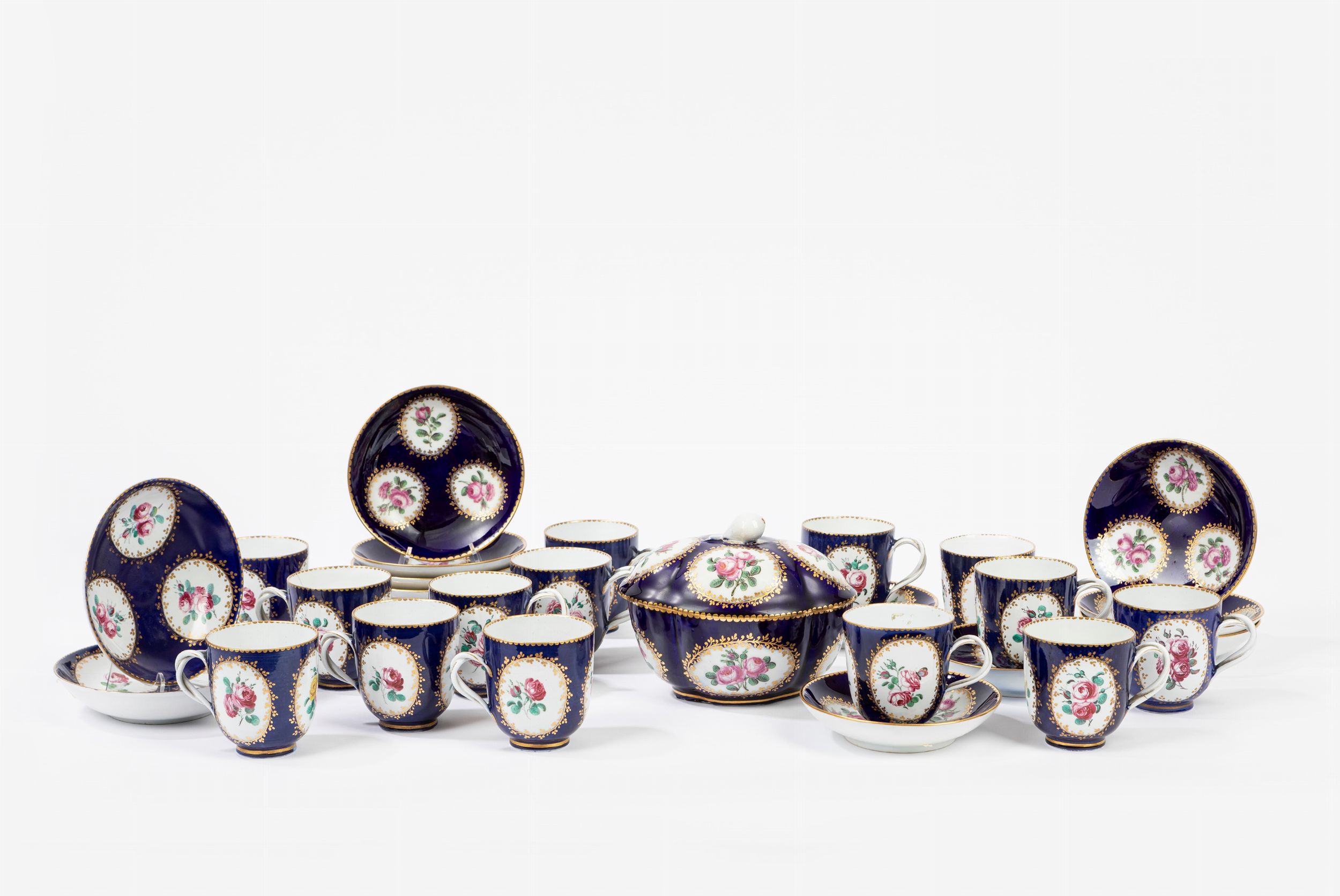 Ginori a Doccia, fine XVIII secolo decoro di impronta francese alle 'roselline' entro riserve a racemi dorati su fondo blu, la zuccheriera di forma mossa con presa a frutto, le anse delle tazzine a cordoli intrecciati, marca di fabbrica alla base della zuccheriera e di dieci piattini (i piattini più tardi, una tazza ricomposta)