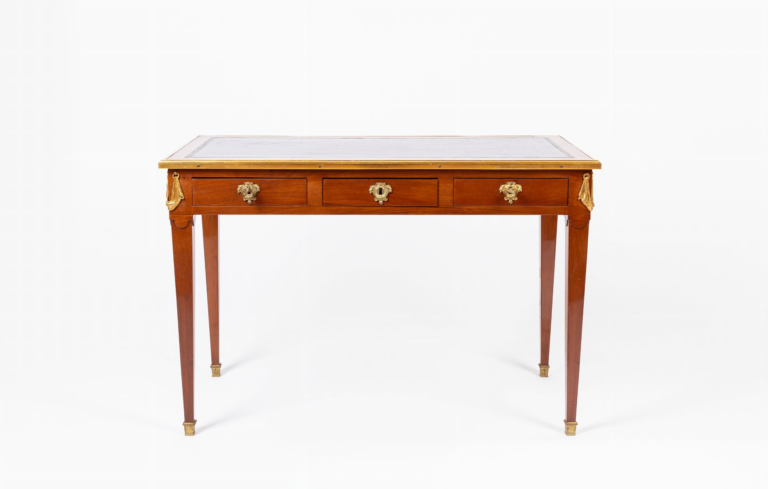 h cm 76x148x67 Francia, Luigi XVI, fine secolo XVIII il piano rettangolare centrato da inserto in pelle e con profilo in bronzo dorato, tre cassetti alla fascia, gli angoli con festoni in bronzo dorato, gambe troncopiramidali con scarpette in bronzo