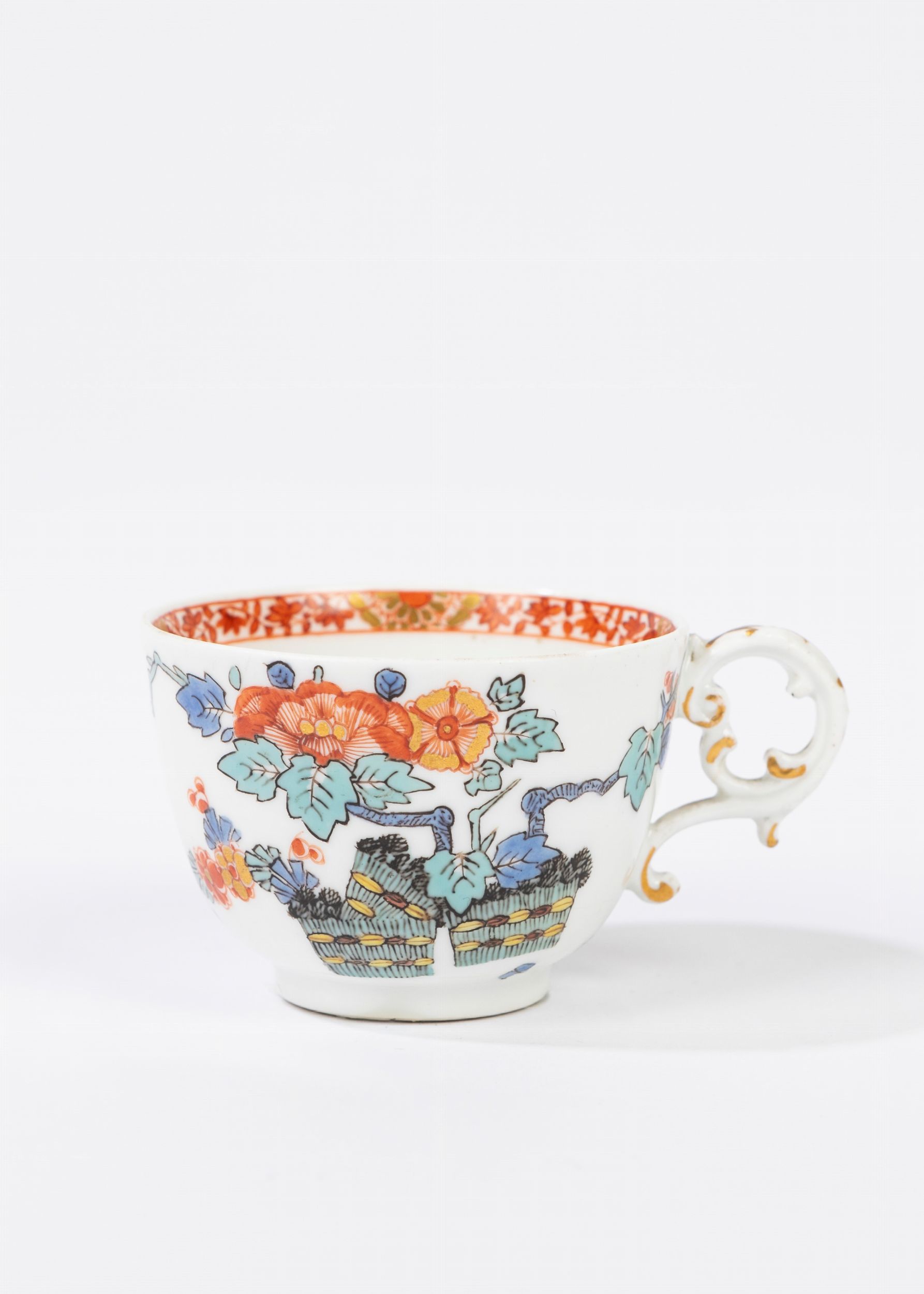 manifattura di Meissen, 1730 circa decorata a motivo Kakiemon , fascia interna a racemi fogliati, ansa a volute, marca di fabbrica alla base