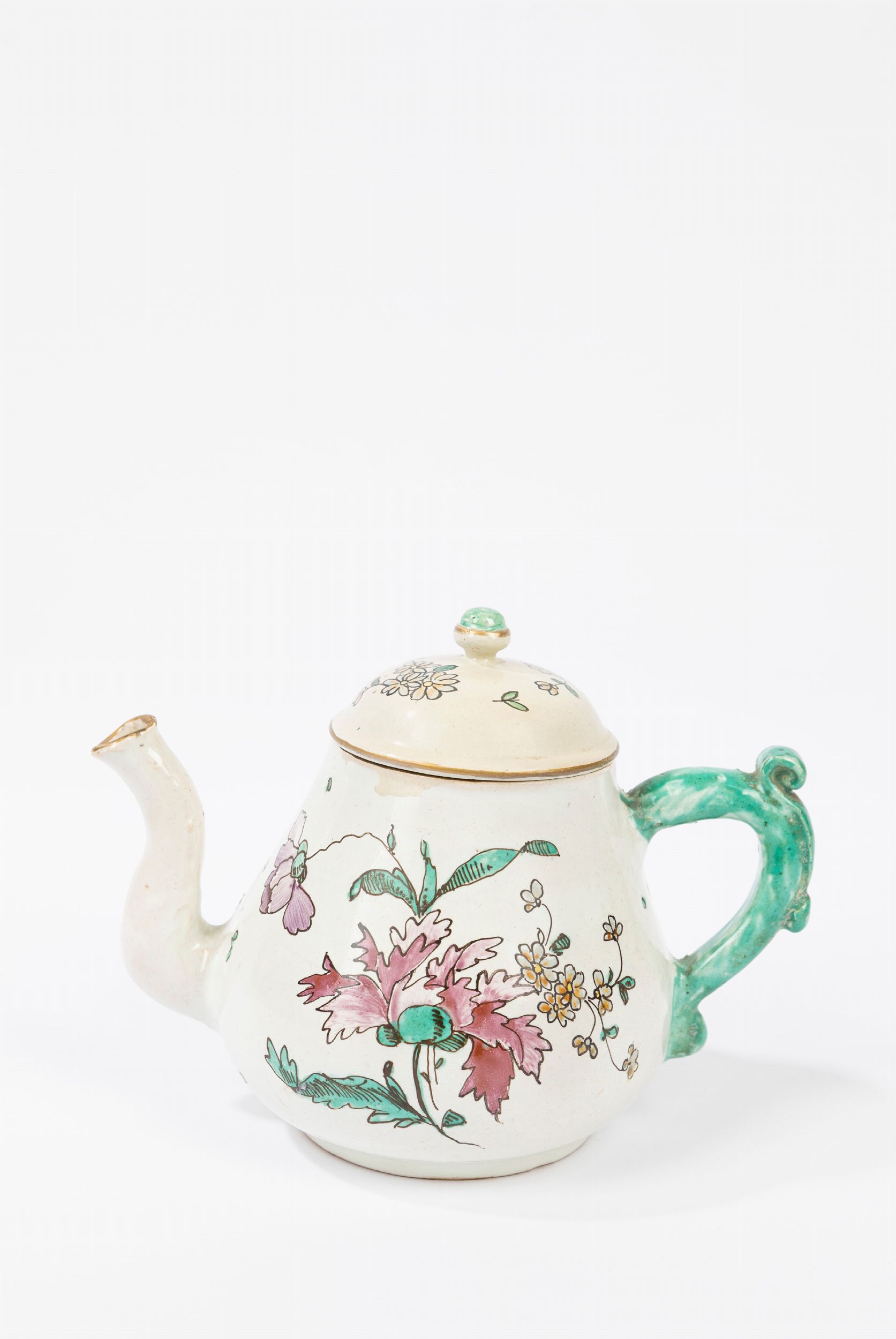 manifattura ligure, fine secolo XIX decoro floreale, ansa mossa a voluta e presa a pomolo in verde (piccolo restauro sul bordo)