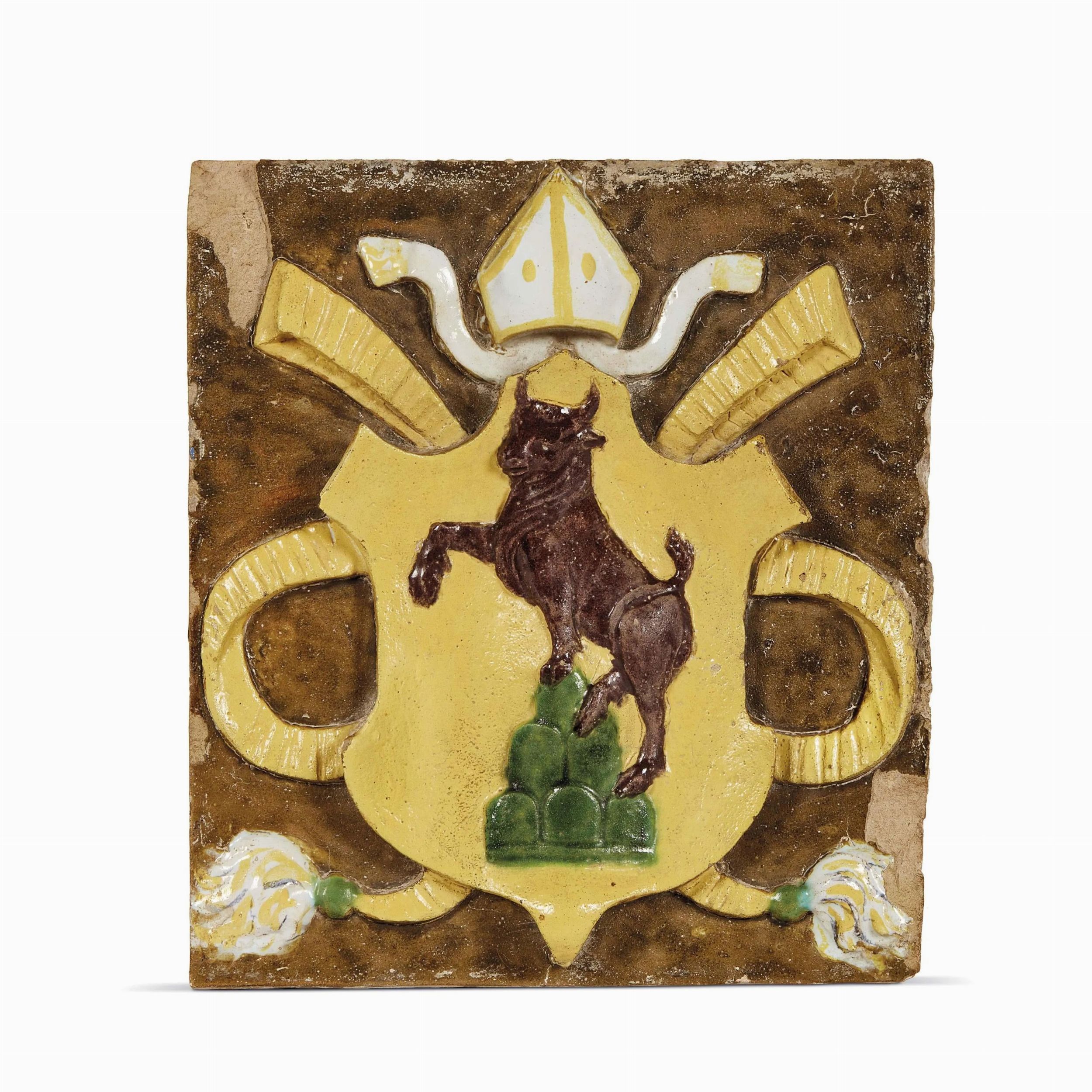 rilievo in terracotta invetriata policroma di forma quadrangolare raffigurante arma timbrata da una mitra vescovile bianca completa di infule ( d’oro, al toro rosso, con la coda rialzata, sostenuto ed in atto di scalare un monte di sei cime all’italiana di verde ) dai cui lati fuoriescono nastri gialli completati da nappe bianche, su formella dal fondo color marrone, cm 22,5x25,5x5,5