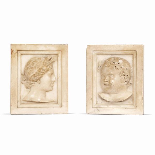 COPPIA DI BASSORILIEVI, LOMBARDIA, SECOLO XVI in marmo di forma rettangolare raffiguranti Allegoria dell'Estate e Allegoria dell'Autunno. Nei rilievi campeggiano due teste riquadrate da una spessa cornice modanata, una femminile di profilo caratterizzata da due spighe inserite nell’acconciatura, l’altra raffigurata di trequarti con un giovane volto paffuto coronato di pampini e chicchi d’una; cm 15,5x13x5,5 (ciascuno)
