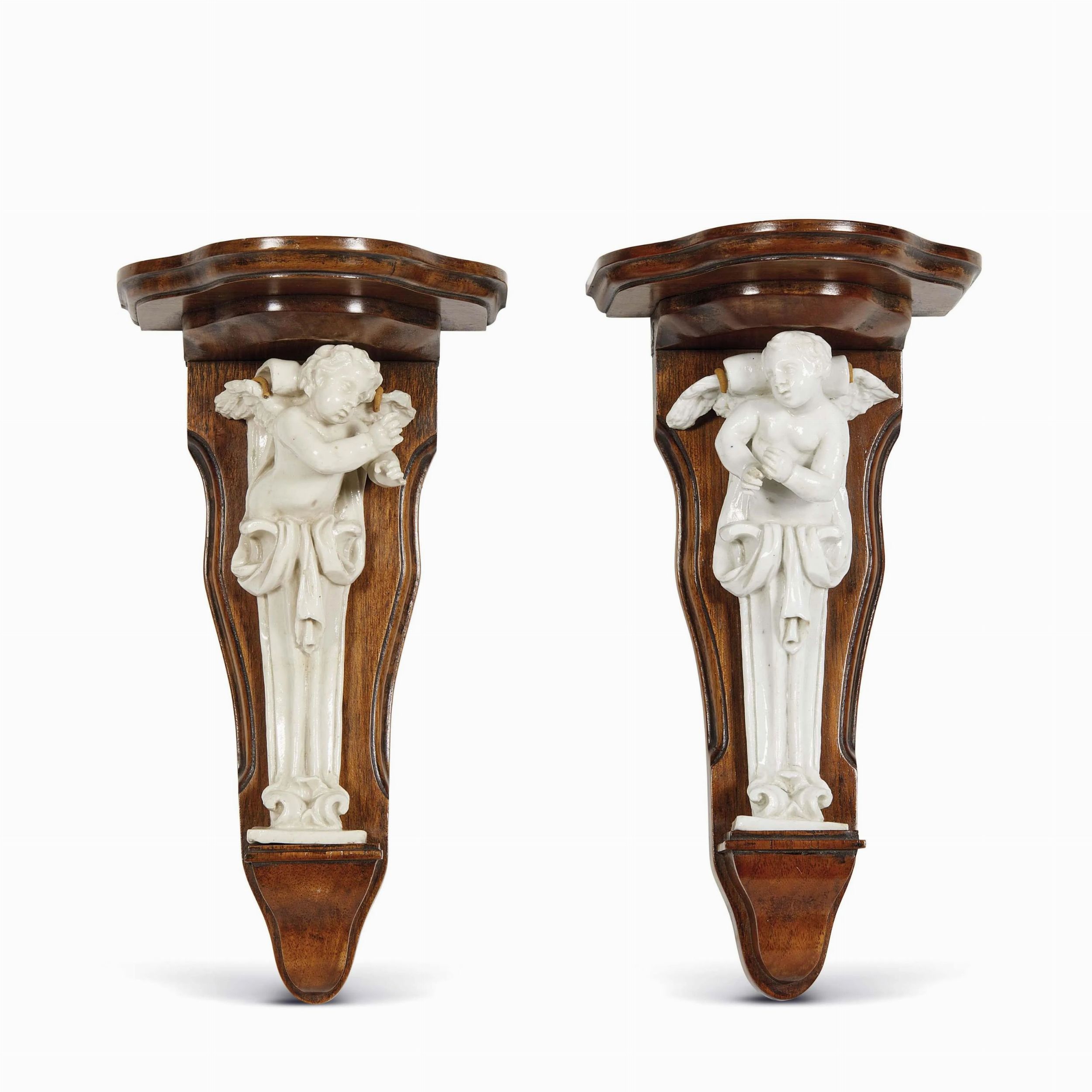 COPPIA DI PICCOLE LESENE, DOCCIA, MANIFATTURA GINORI, 1750 CIRCA in porcellana bianca raffiguranti due angeli musicanti su pilastri scanalati. Questi elementi avevano funzione decorativa, e si trovano ad esempio ad impreziosire la base di ebano della scultura in porcellana Venere al bagno derivata della statua degli Uffizi e realizzata dalla manifattura nel 1750. Si conoscono altri esempi di tali rilievi, di cui due nelle collezioni del Castello Sforzesco di Milano ed uno, policromo nella collezione Cagnola alla Gazzada. Le due sculture si presentano attualmente montate con mensole in legno; cm 19,5x10x6,5 e cm 19,5x8,5x5 le sculture, cm 29,5x15,5x9,5 le mensole