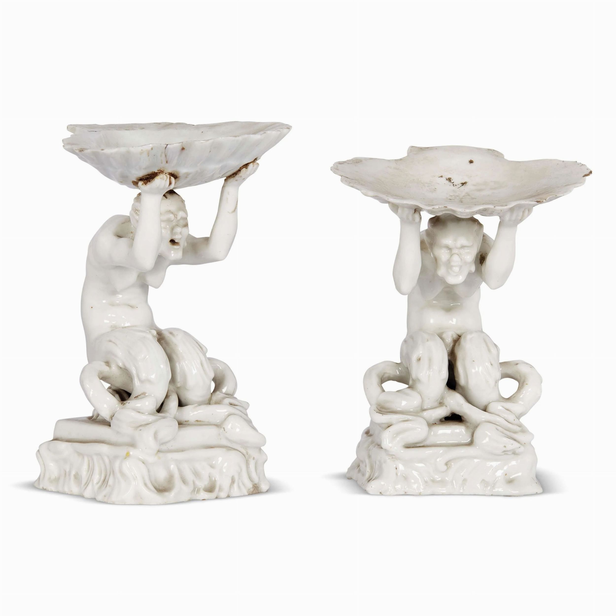 in porcellana bianca modellate a raffigurano due tritoni marini che sorreggono una conchiglia, originariamente appartenenti ad un trionfo da tavola. Le maestranze di Doccia furono attente esecutrici, soprattutto nel primo periodo, di importanti opere scultoree, senza trascurare quelle legate alla tavola, che arricchiscono con elaborati trionfi o i dejeuneé talvolta policromi, rivaleggiando con quelli prodotti dalle manifatture europee. Per la figura del tritone si veda quello del Museo Stibbert o le figure di deità marine, come i tritoni grotteschi presenti nel candeliere della Villa Floridiana al Museo Duca di Martina a Napoli; cm 15x10,5x10 e cm 14x10,5x10