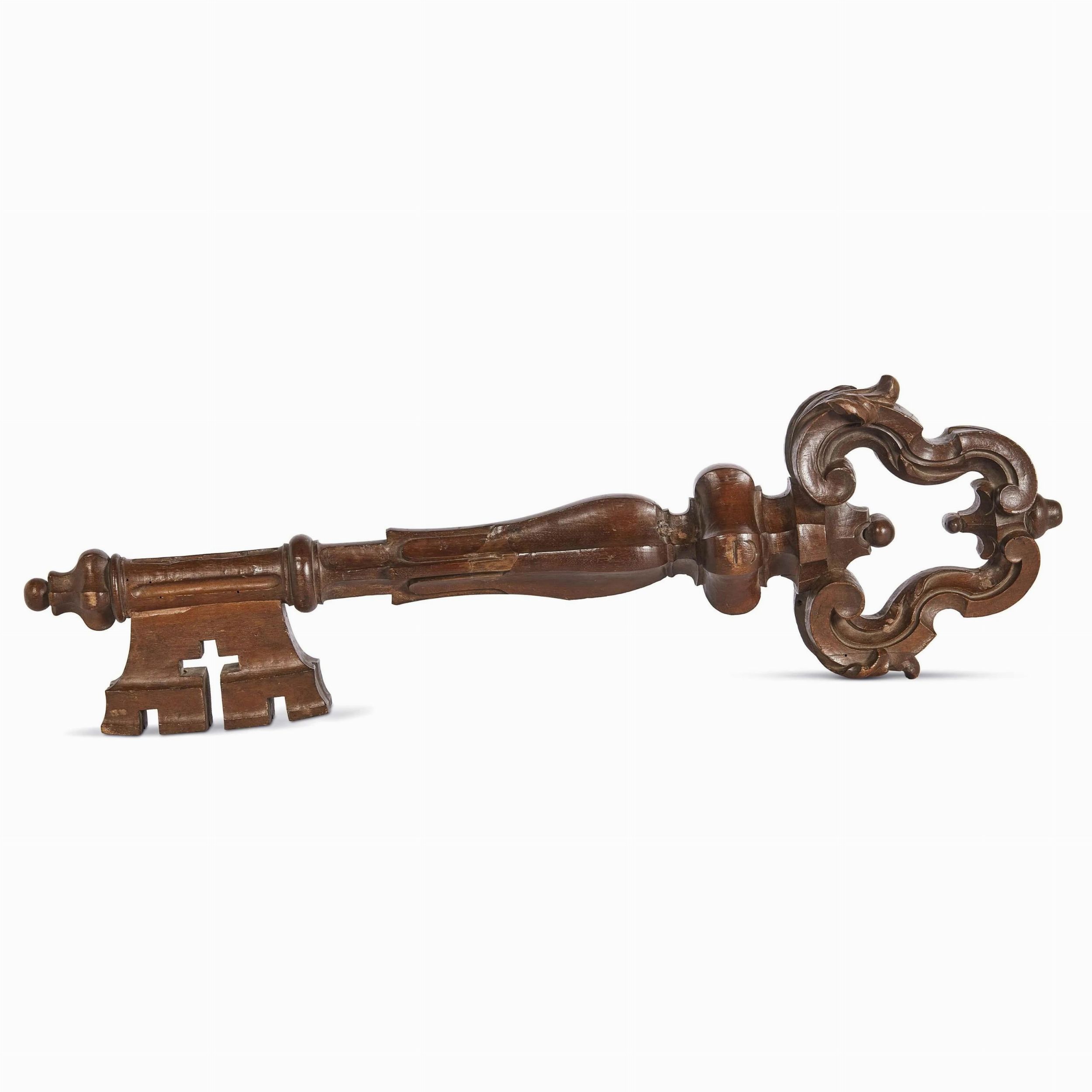 in legno di noce scolpito e intagliato a riprodurre una chiave di notevoli dimensioni, cm 80x24x12