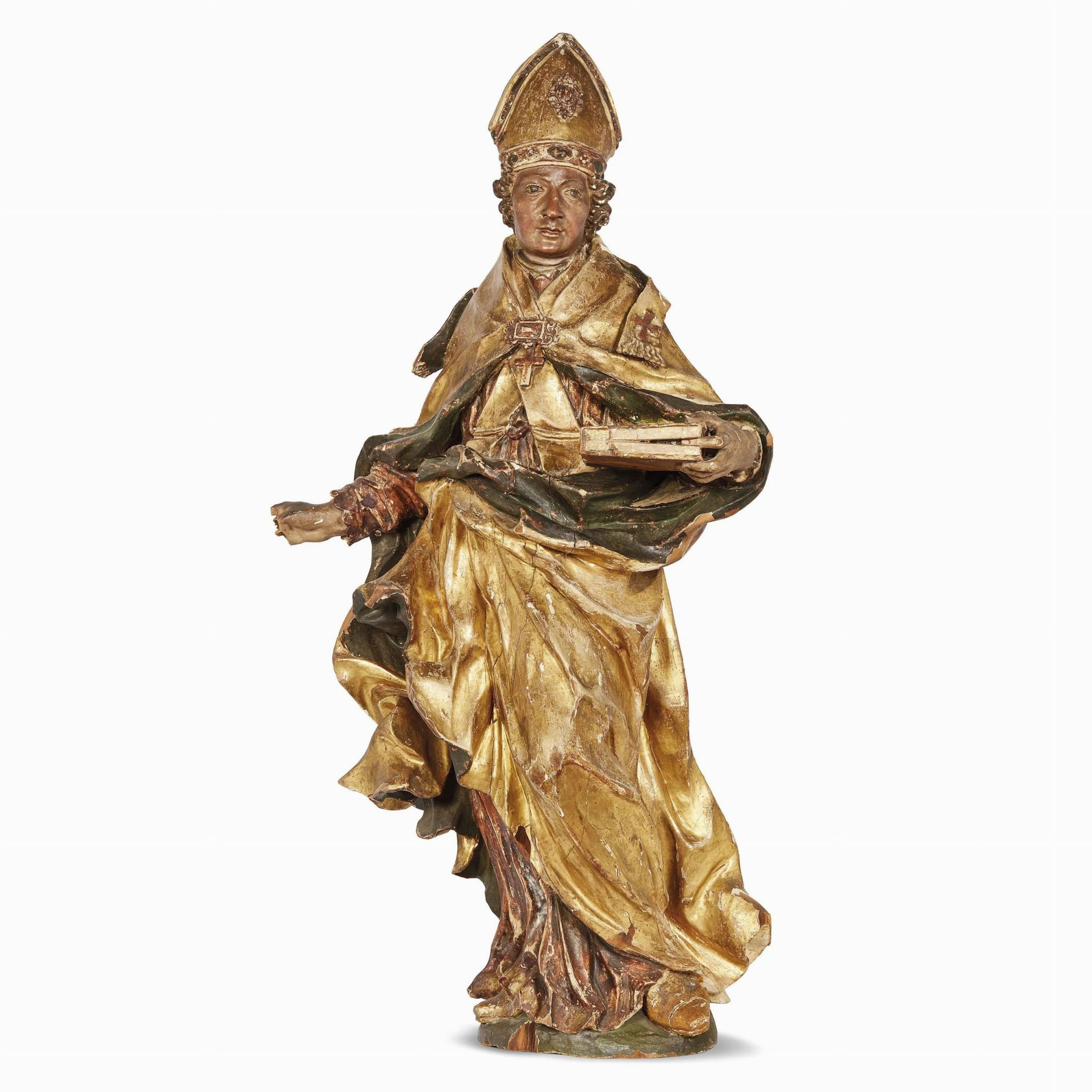 Attributed to Francesco Pianta, Holy bishop, carved gilted and polychromed wood