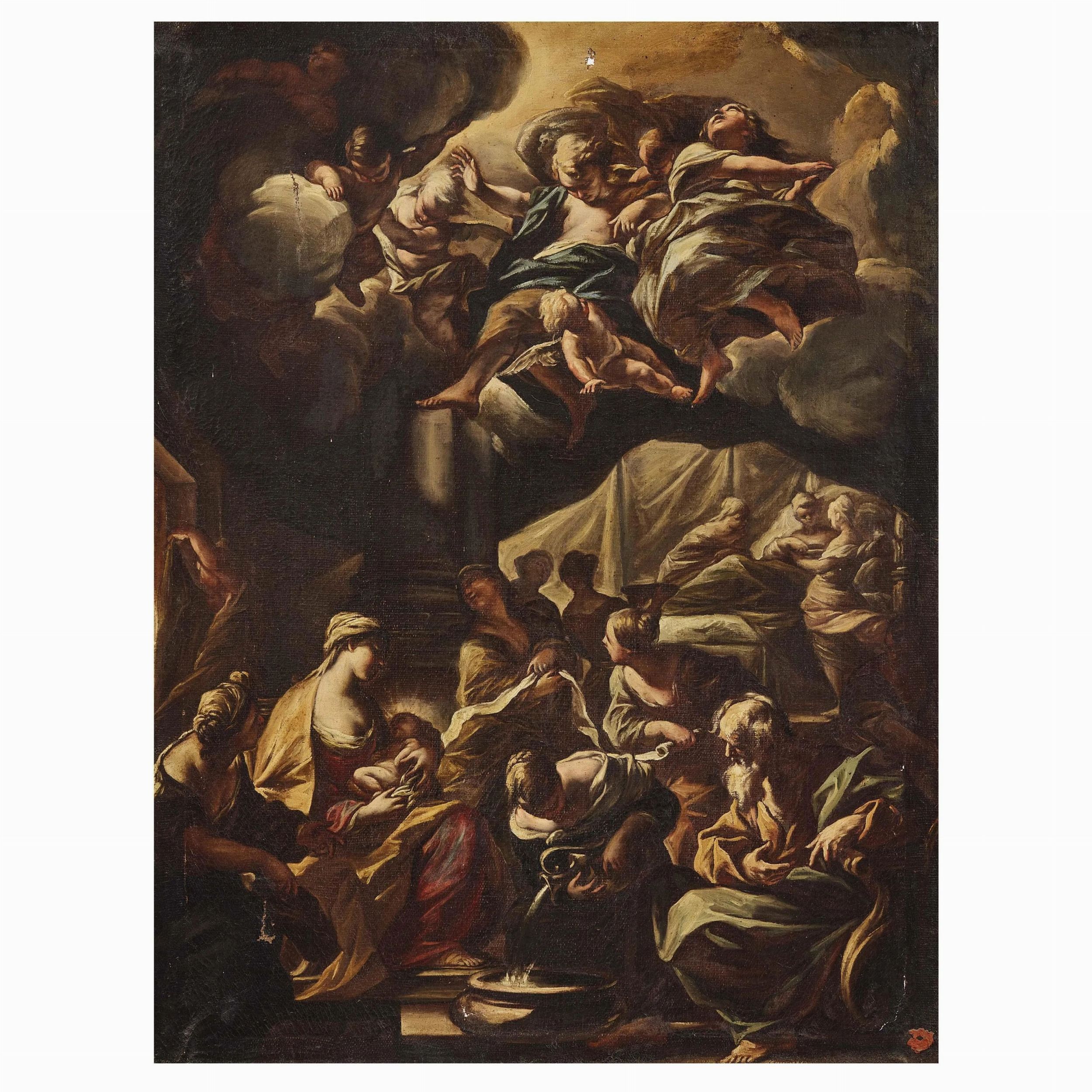 Giovanni Battista Beinaschi (Fossano, 1636 – Napoli, 1688) NATIVITA' DI MARIA olio su tela, cm 99x74 al verso in basso a destra, una ceralacca frammentaria
