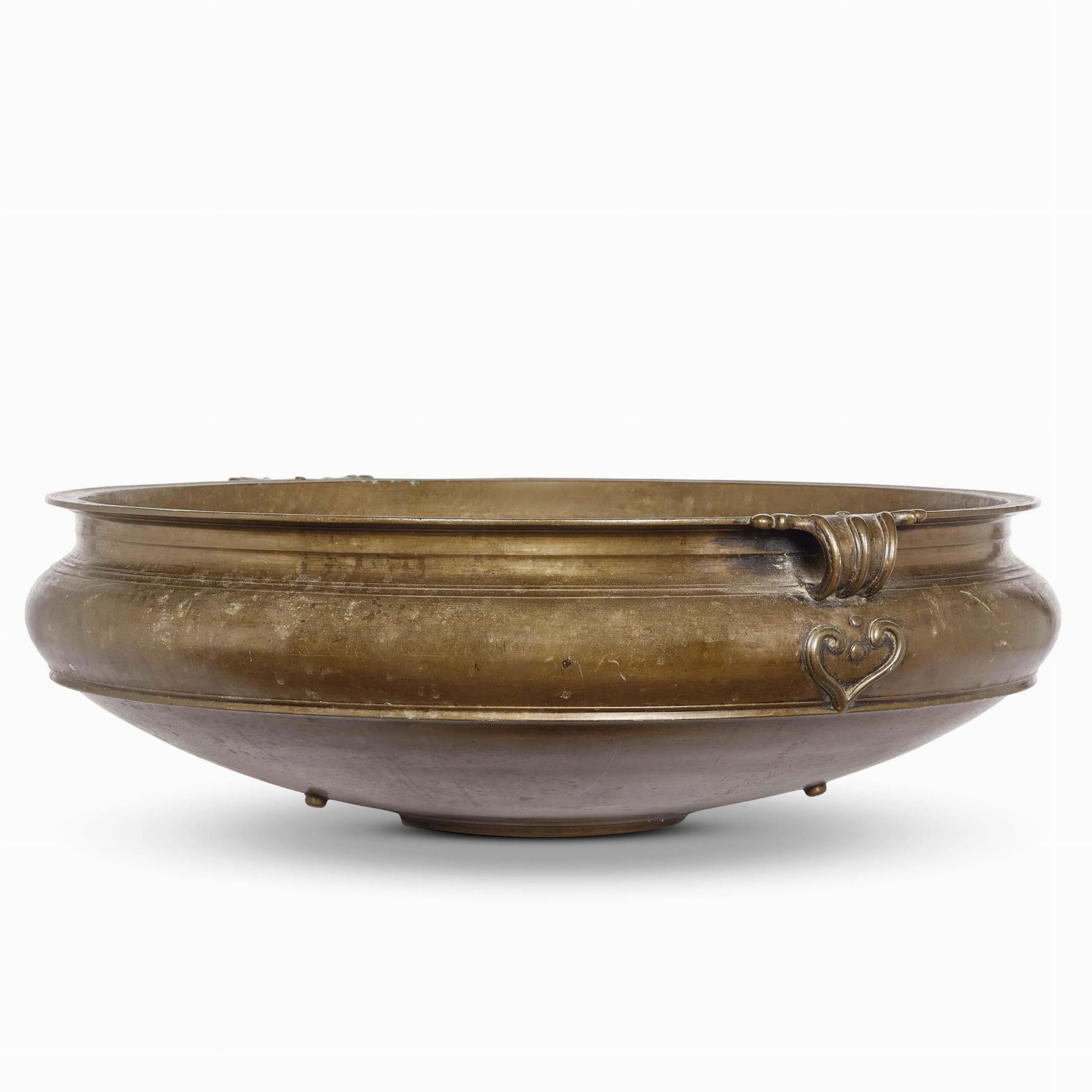 GRANDE BACILE, TOSCANA, INIZI SECOLO XVII in bronzo di forma circolare, corpo caratterizzato da ampia apertura con orlo estroflesso su collo verticale, alta fascia centrale bombata e base con profilo angolato su piede piano a disco. In prossimità del bordo superiore due prese contrapposte sagomate con nervature verticali facilitano la movimentazione del bacile, a sormontare due elementi decorativi a rilievo a forma di cuore stilizzato; alt. cm 23, diam. cm 72