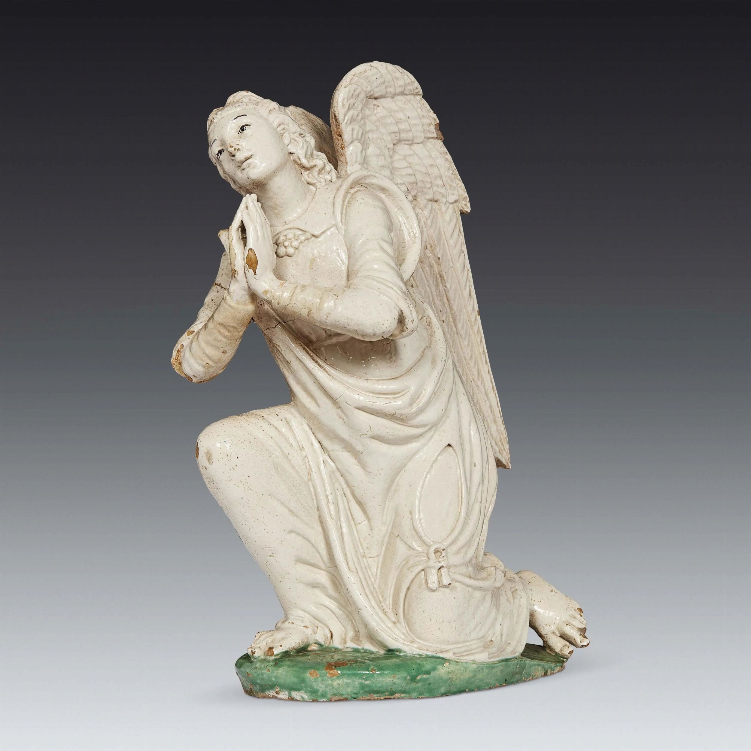 Raffigurato genuflesso con le mani giunte al petto e lo sguardo adorante, questo splendido angelo ricorda evidentemente modelli robbiani spesso presenti a decorare altari complessi o singole opere, in forma di rilievo oppure a tutto tondo. Le caratteristiche tecniche e stilistiche suggeriscono di attribuire l’opera a quel Santi Buglioni che secondo il Vasari rimase a Firenze erede incontrastato del segreto robbiano: “che solo sa oggi lavorare questa sorta di sculture”, ed un interessante confronto può essere fatto con la figura inginocchiata nel rilievo della Madonna del Soccorso in collezione Ciro Leone a Napoli, oppure con gli angeli del grande rilievo della Madonna della Cintola conservato nella chiesa nuova di Porrena di Poppi dedicata a Santa Maria Assunta.