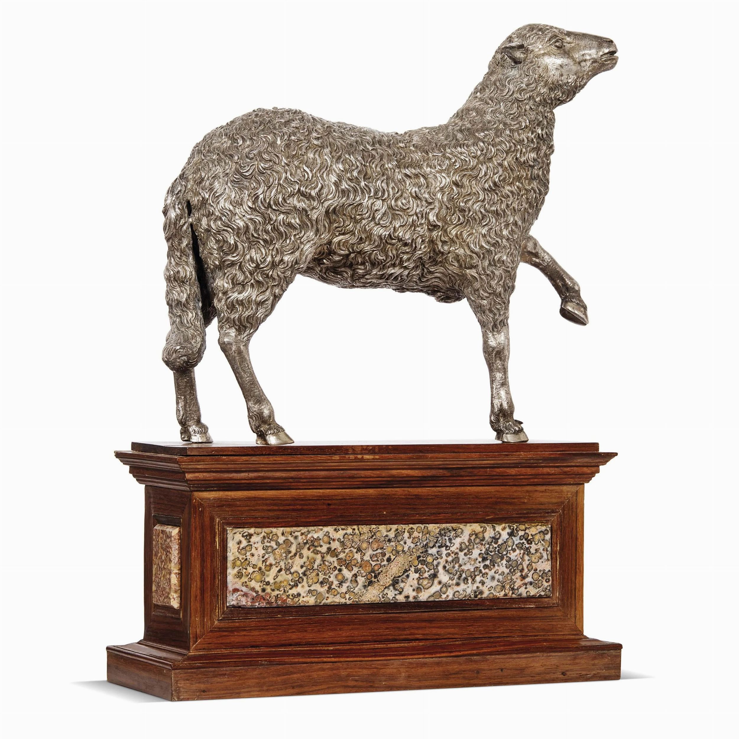 scultura in argento montata su alto piedistallo in legno impreziosito da applicazioni in marmo. La posa dell’agnello, rappresentato con la zampa anteriore sinistra levata, ricorda l’emblema dell’ Arte della Lana , corporazione le più potenti di Firenze e sicuramente quella che contava il maggior numero di lavoratori, presente in città a partire dal 1317 e attiva fino al 1770. Lo stemma della corporazione raffigurava infatti l’Agnus Dei argentato con una zampa sollevata a reggere la bandiera del Comune di Firenze; cm 26,5x29x8 la scultura, cm 14,5x29x12 la base