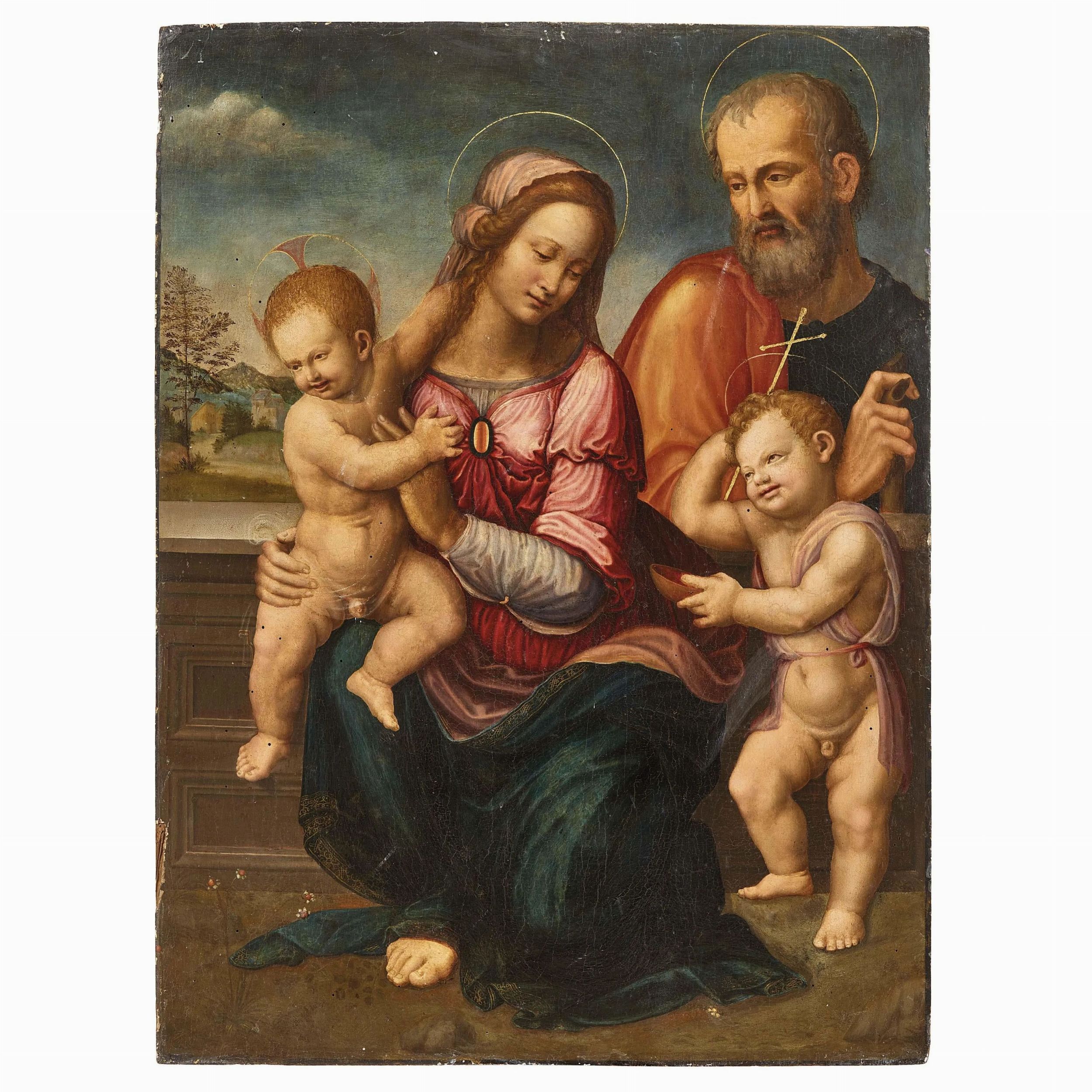 Florentine school, early 16th century HOLY FAMILY WITH SAINT JOHN oil on panel, cm 86,5x63 inscribed 'Niccolo Ximenez' on the reverse side of the panel