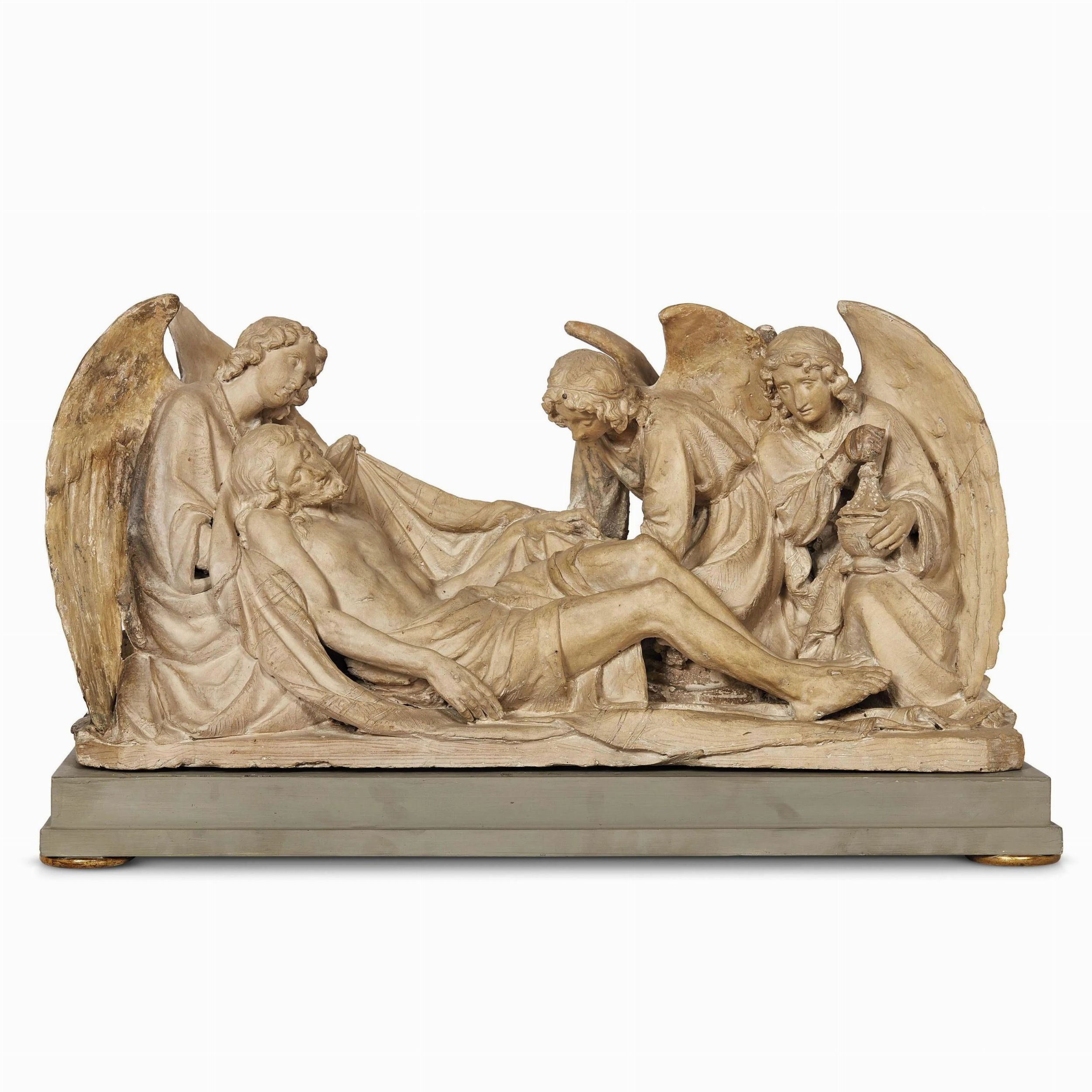 gruppo scultoreo in terracotta raffigurante la scena evangelica nella quale Cristo, ormai morto, viene avvolto in un sudario da due degli angeli inginocchiati al suo fianco, mentre il terzo regge un prezioso vaso contenente l'unguento da spalmare sul corpo; cm 30x65x20; completo di base lignea non pertinente, cm 5,5x64x25,5
