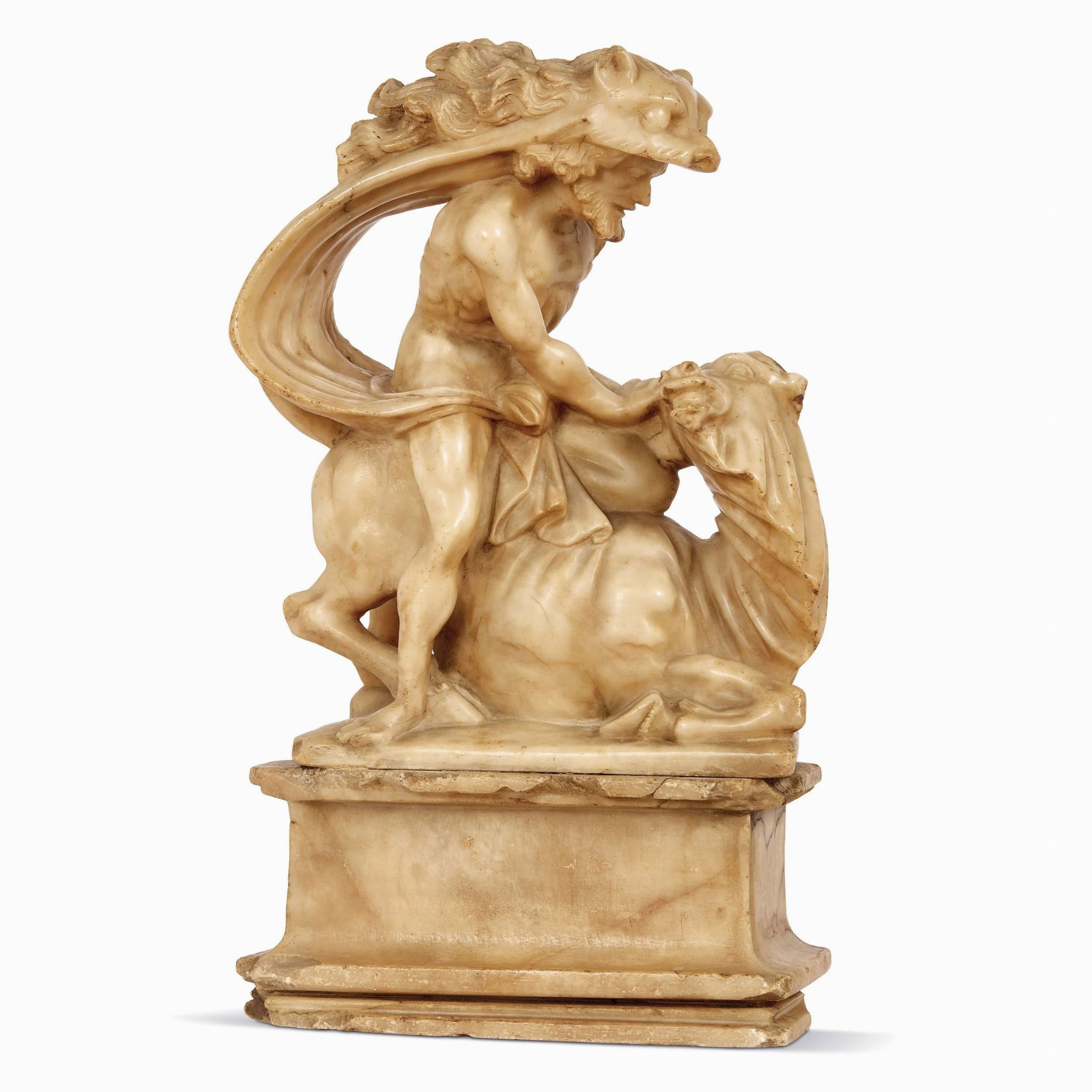 Scuola lombarda, secolo XVII ERCOLE E ACHELOO gruppo scultoreo in alabastro raffigurante l’episodio mitologico della lotta tra Ercole e Acheloo per la conquista della mano di Deianira, figlia di Eneo, re di Calidone, e di Altea; cm 37,5x22x11