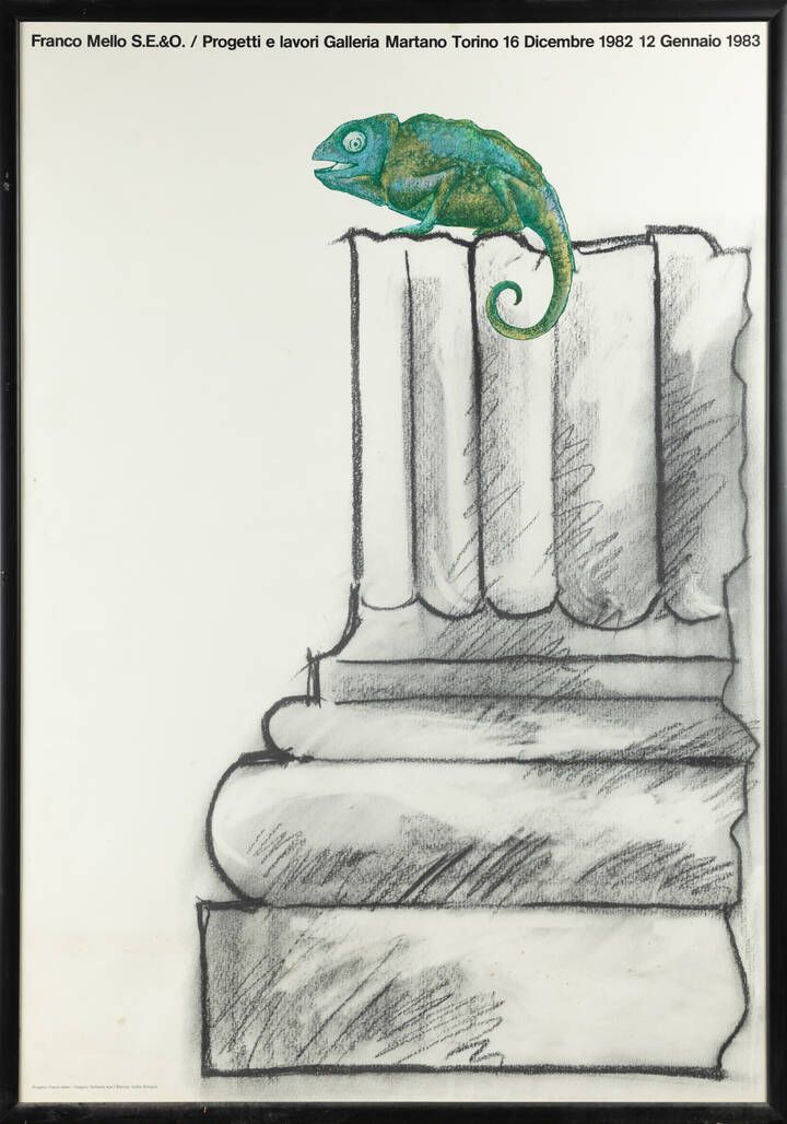 100x69 5 manifesto Opera firmata al retro Manifesto della mostra Franco Mello S.E.&O. Progetti e lavori Galleria Martano Torino 16 dicembre 1982-12 gennaio 1983 Progetto: Franco Mello/ Disegno: Raffaella Ape/ Stampa: Grafis Bologna Bibl.:-F. Mello Opera prima. Storia illustrata di un'avventura creativa svagata poetica Arte su carta Torino 2023 ripr. a colori p. 115 -Designer by accident ripr. a colori Piccoli difetti